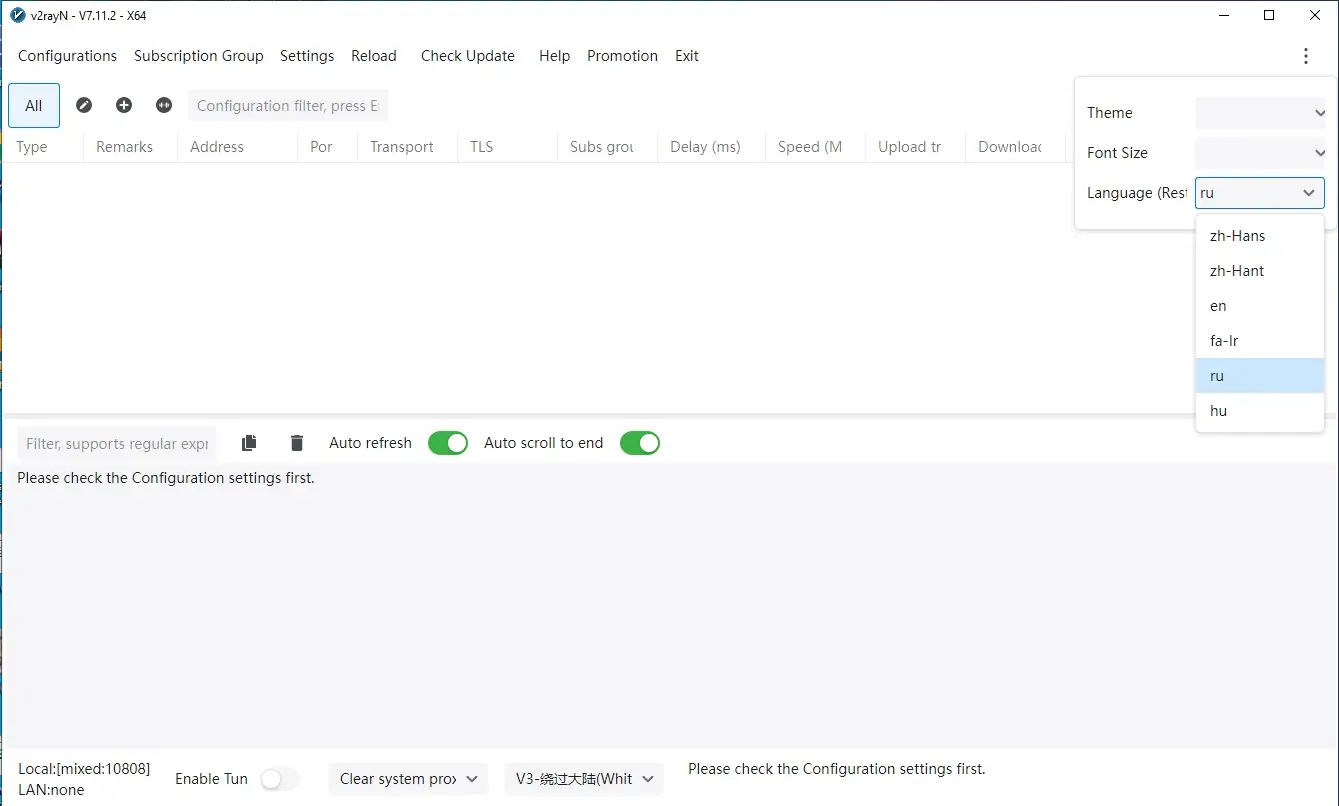 - Настроить язык интерфейса и подключения, добавив необходимые сервера или подписки.