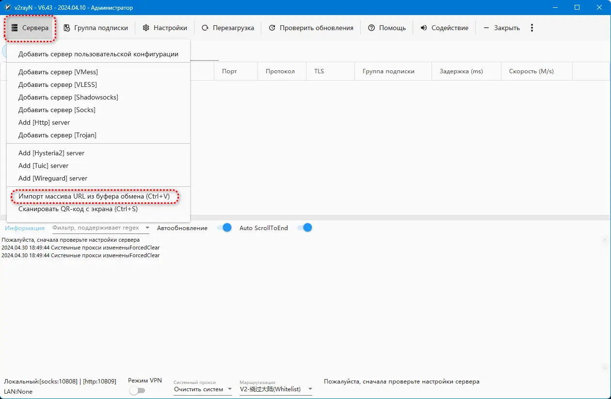 - Добавить сервера вашей конфигурации, вставляя коды или подписки.