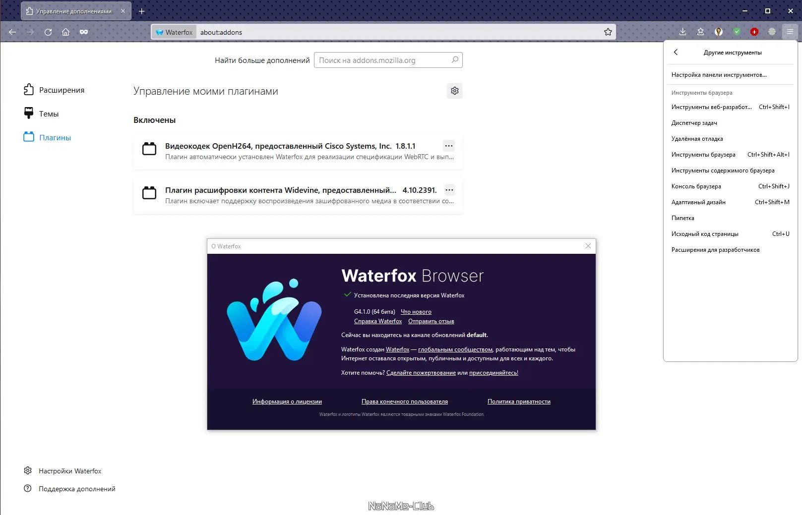 - Не все расширения, разработанные для Firefox, совместимы с Waterfox