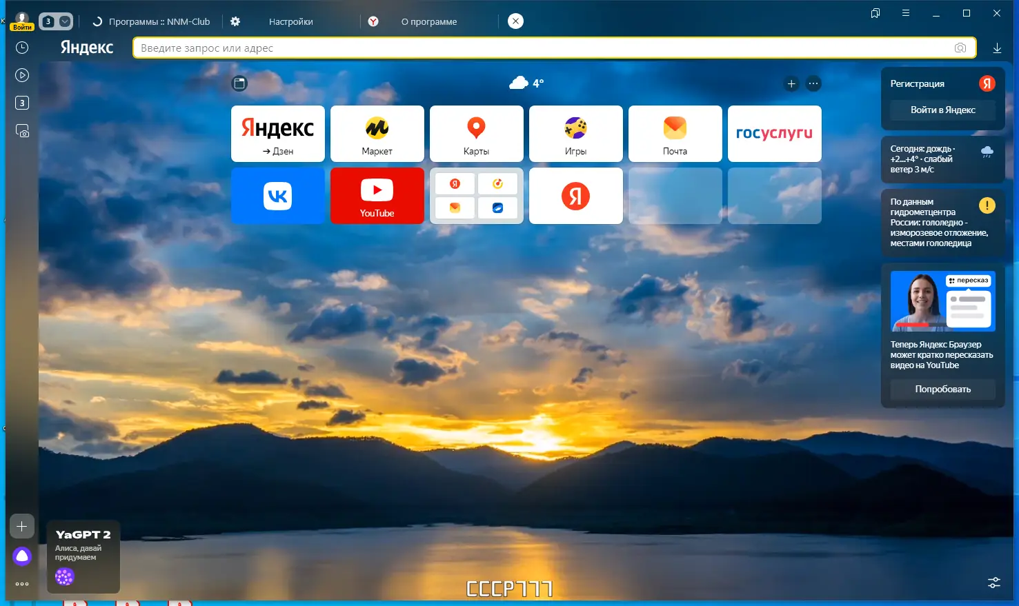 Яндекс.Браузер — это современный веб-обозреватель, основанный на движке Chromium, который сочетает в себе высокую производительность и широкий функционал для удобной работы в интернете. Он разработан с учётом потребностей как новичков, так и опытных пользователей, предлагая интуитивно понятный интерфейс и множество инструментов для повышения эффективности поиска и навигации. Встроенные технологии обеспечивают быструю загрузку страниц даже при медленных соединениях, а интегрированные средства безопасности защищают от вирусных угроз и нежелательных трекеров. Среди преимуществ — возможность переносить настройки из других браузеров, использовать расширенные системы поиска и перевод контента, а также управлять вкладками, группировать их и запускать веб-приложения прямо из браузера.