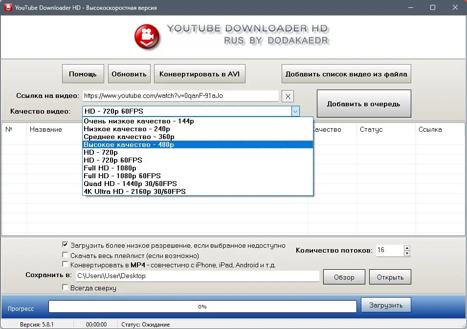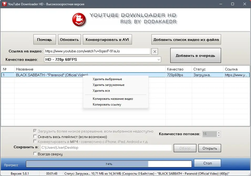 Youtube Downloader HD — это простая и удобная в использовании бесплатная утилита, предназначенная для быстрого скачивания видео с YouTube. Для работы достаточно вставить ссылку на интересующий ролик в окно программы и выбрать папку для сохранения. Программа автоматические сохраняет файл в формате AVI или MP4, обеспечивая качество высокой четкости, включая такие современные стандарты как Full HD, 4K Ultra HD и Quad HD. Отличительной особенностью является поддержка загрузки видео высокого качества, а также возможность конвертировать их в форматы, совместимые с портативными устройствами.