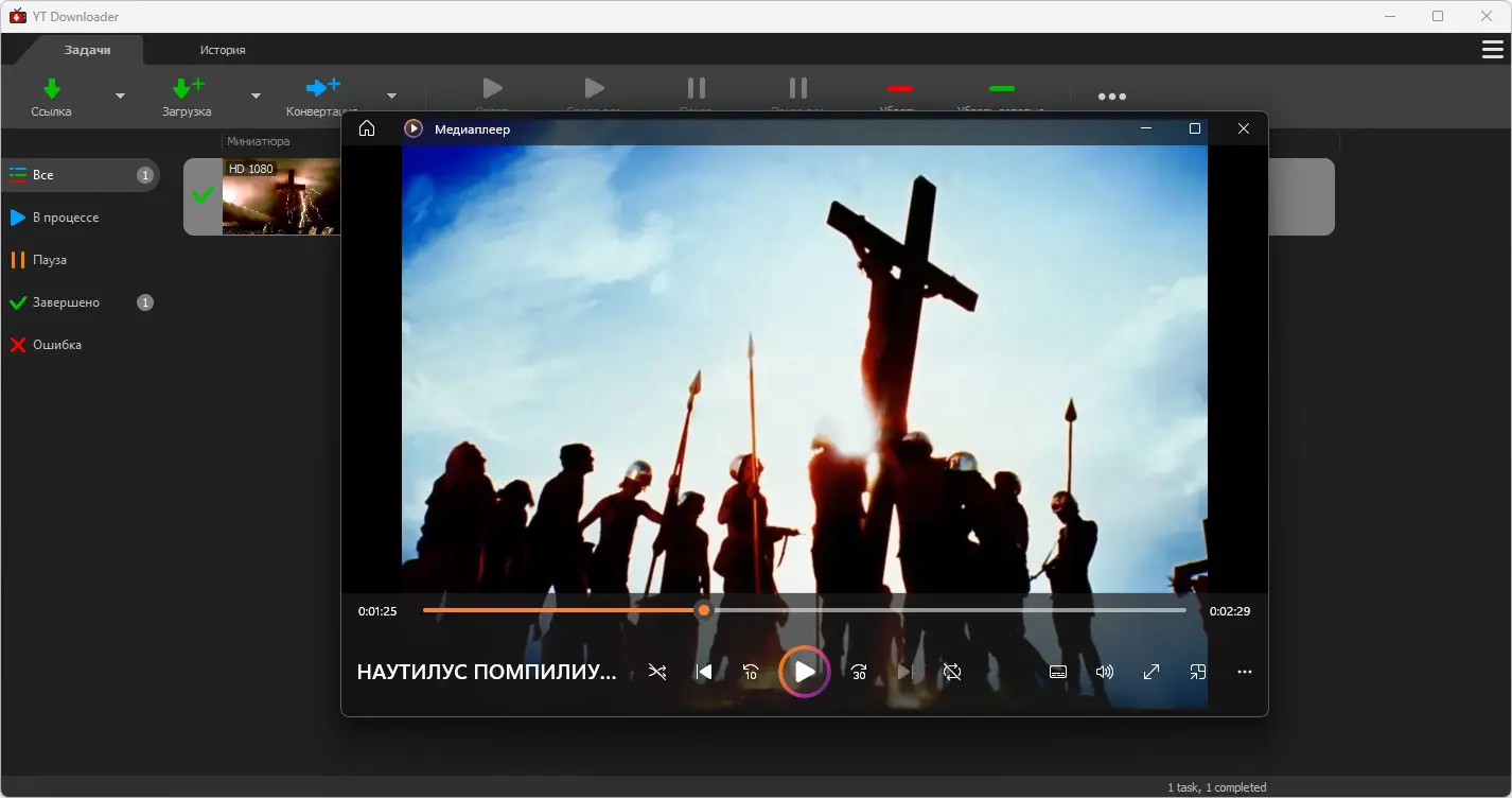 - Встроенный медиаплеер для просмотра скачанных видео и прослушивания аудио