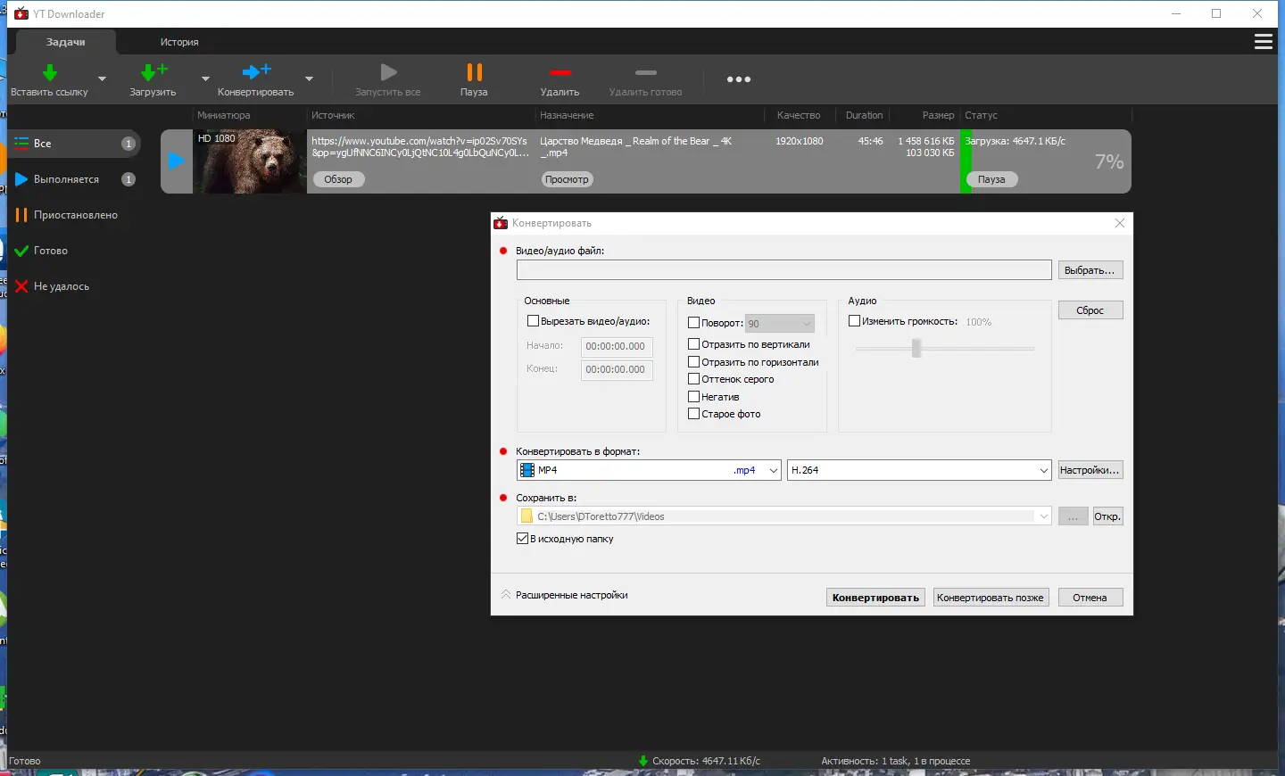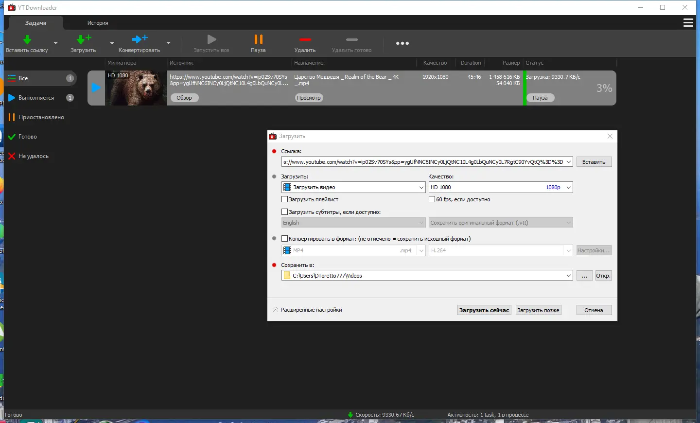 - Многопоточная загрузка нескольких видео одновременно и возможность приостановки/возобновления процесса.