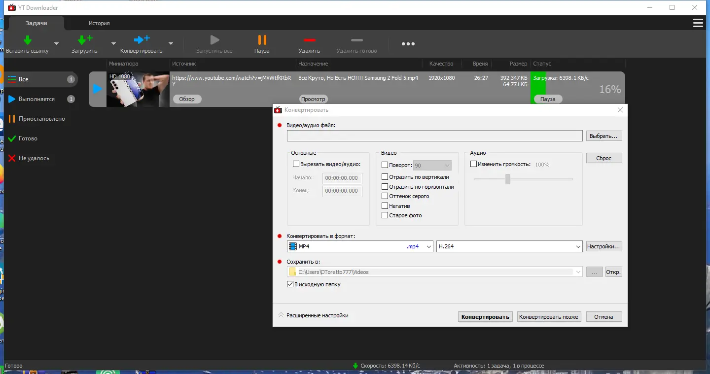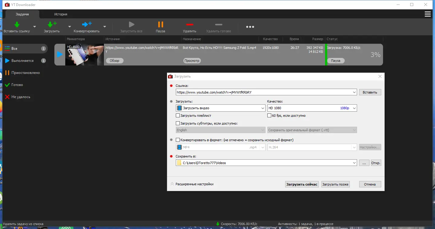 - Высокая скорость загрузки и возможность скачивания нескольких видео одновременно