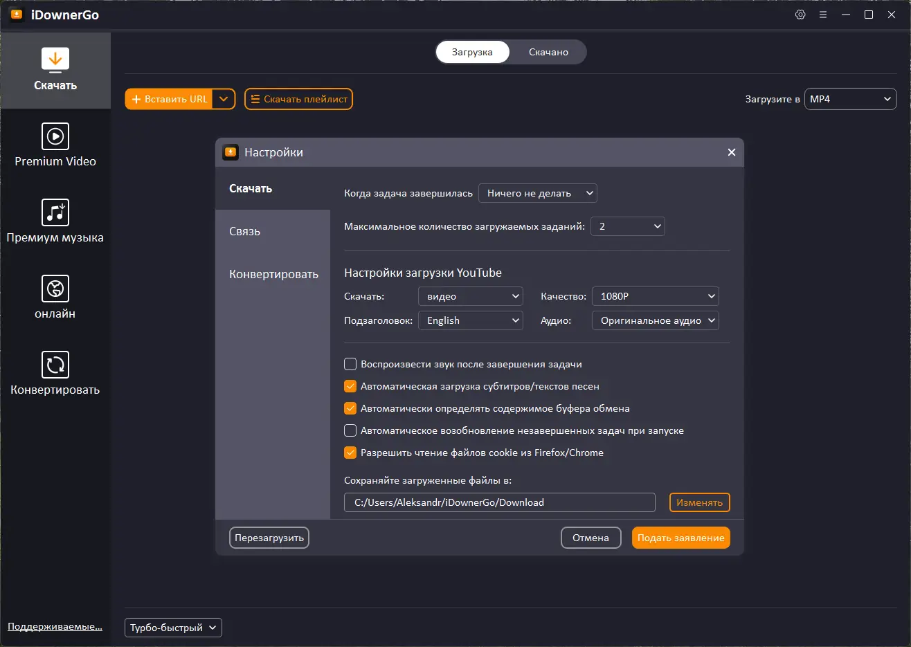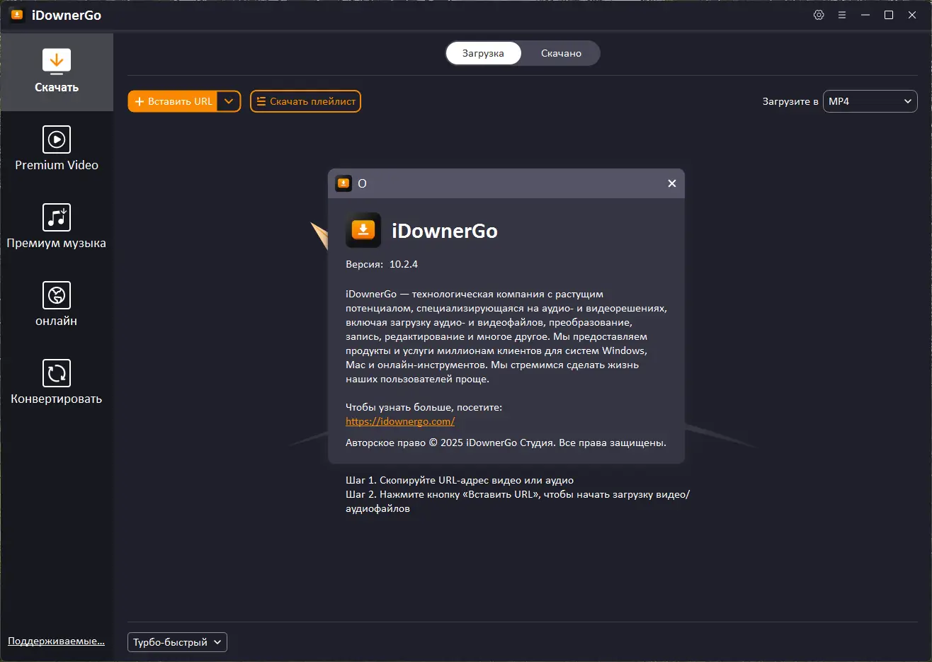 iDownerGo – это современный инструмент, предназначенный для загрузки мультимедийных файлов с таких платформ, как YouTube, Dailymotion, Vimeo, Spotify, Facebook, TikTok, X (Twitter) и Instagram. Основные преимущества приложения заключаются в простоте использования благодаря интуитивно понятному интерфейсу и автоматическому распознаванию ссылок через мониторинг буфера обмена. Пользователи могут сохранять файлы в различных форматах, таких как MP4, AVI, MKV, MP3, AAC и другие, что делает приложение универсальным для разных устройств и целей. Встроенный браузер помогает искать нужный контент прямо в программе, а функция автоматического завершения загрузки обеспечивает автоматизацию работы.