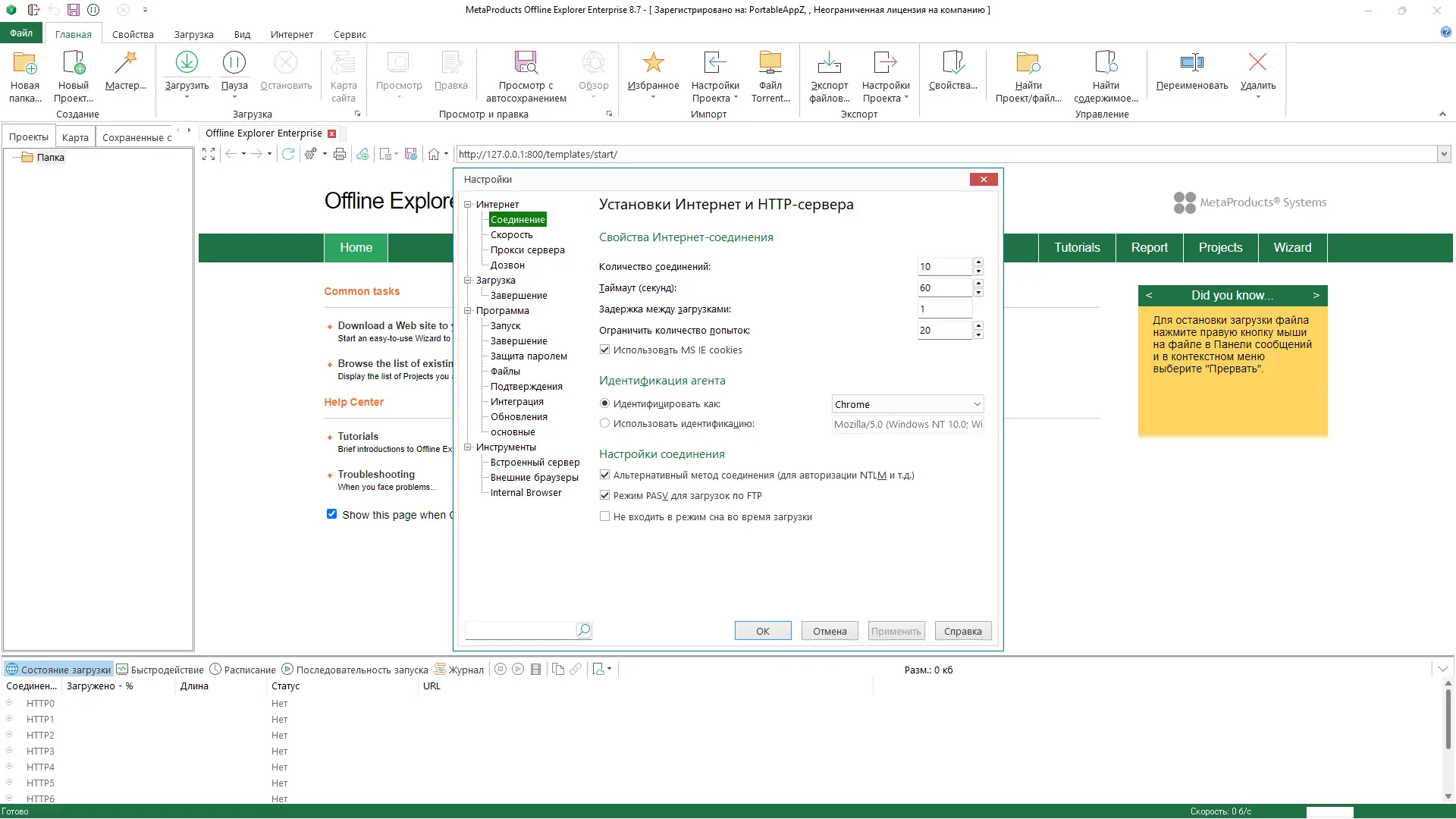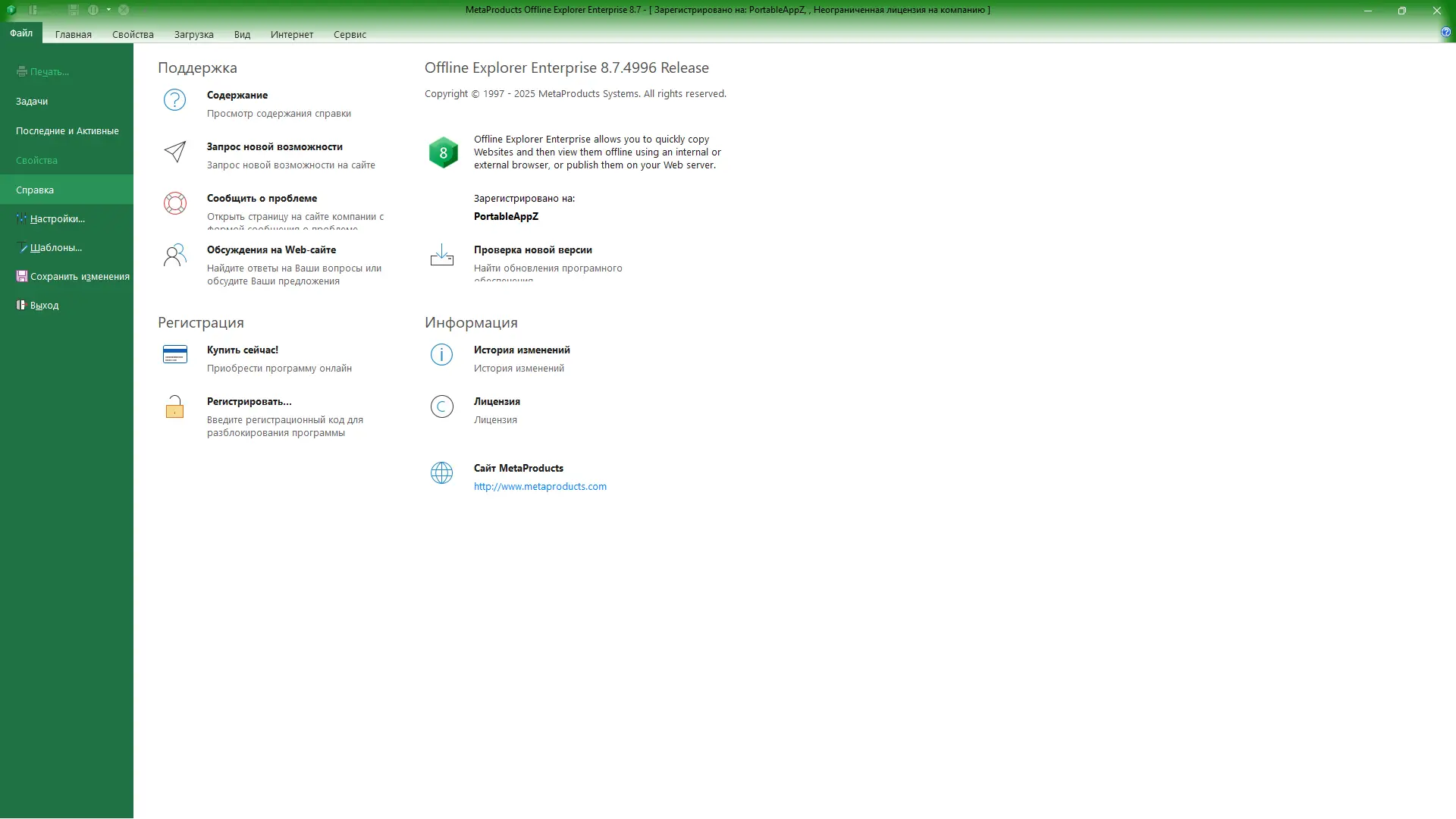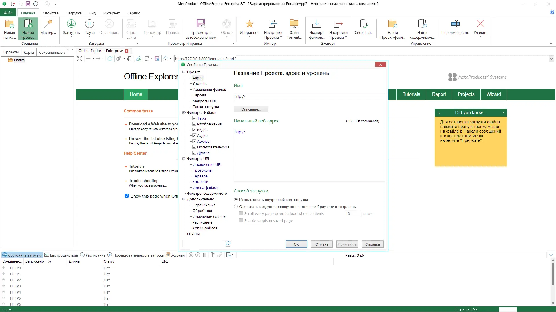MetaProducts Offline Explorer Enterprise — мощнейшая программа, позволяющая скачивать как отдельные файлы, так и целые веб-сайты (HTTP, FTP и HTTPS) на жесткий диск для их последующего офлайн просмотра. Она подходит для работы как на отдельном компьютере, так и в рамках локальной сети, обеспечивая быстрый и удобный способ получения и обработки интернет-контента.