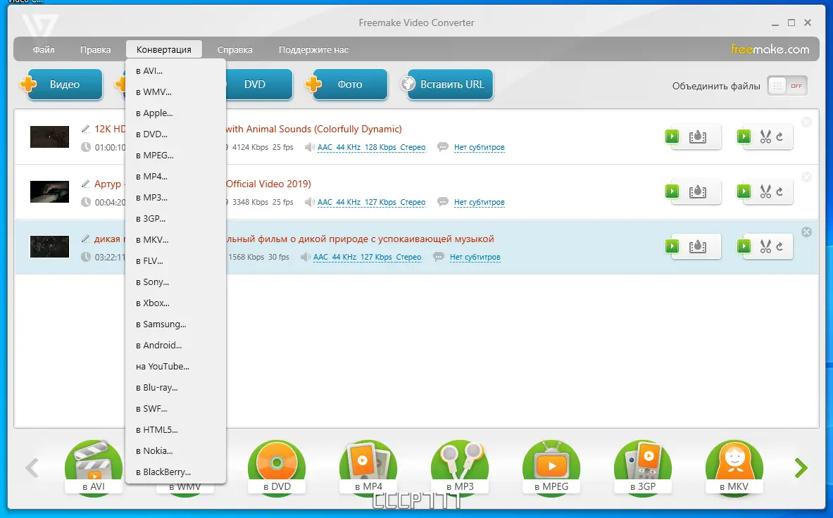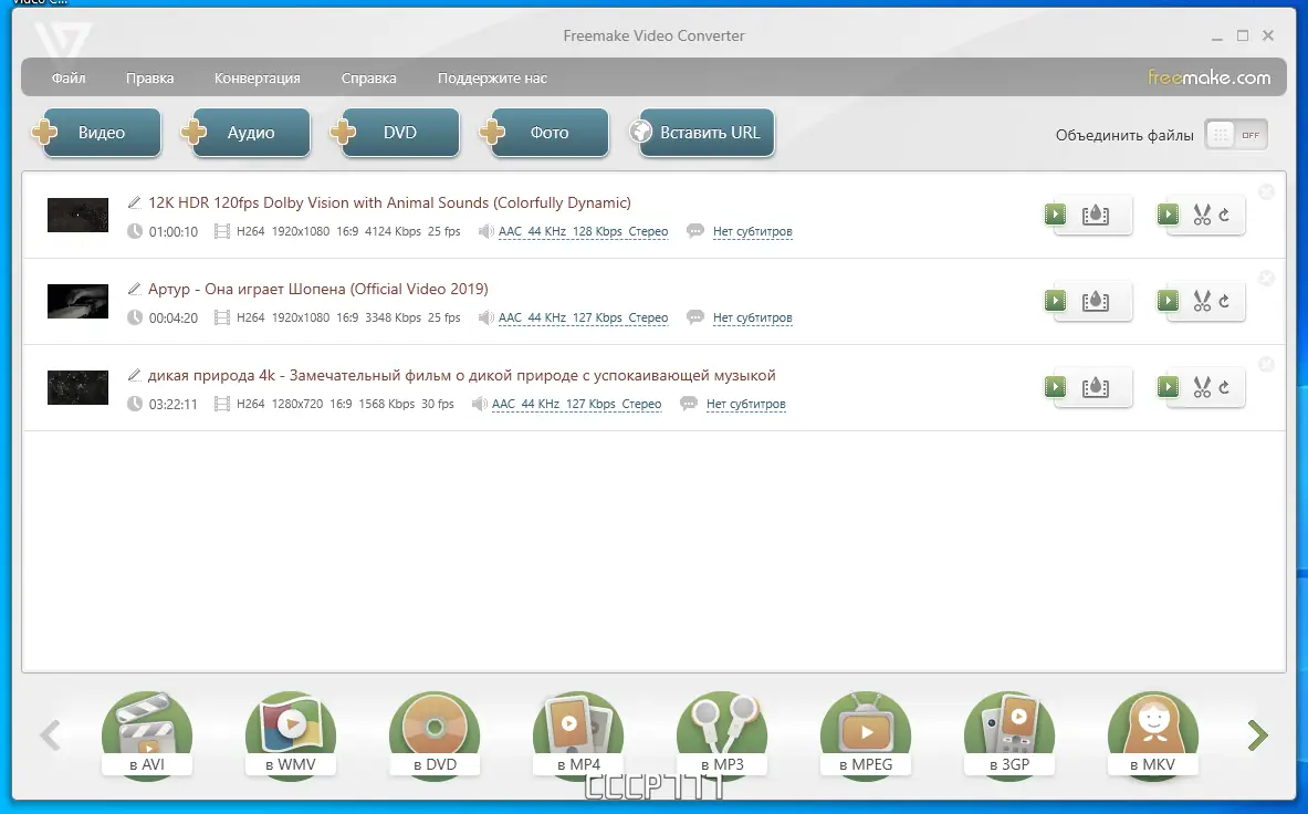 Freemake Video Converter — это мощный и удобный инструмент, который позволяет быстро конвертировать видео и аудио в более чем 500 популярных форматов, создавать слайд-шоу и извлекать звуковые дорожки. Программа поддерживает работу с видео с различных сайтов, таких как YouTube, Facebook и Vimeo, позволяет подготовить файлы к просмотром на мобильных устройствах, а также записывать отснятые материалы на DVD или Blu-ray диски. Встроенный редактор дает возможность обрезать клипы, поворачивать видео, удалять черные полосы и объединять файлы, делая процесс редактирования максимально простым и удобным.