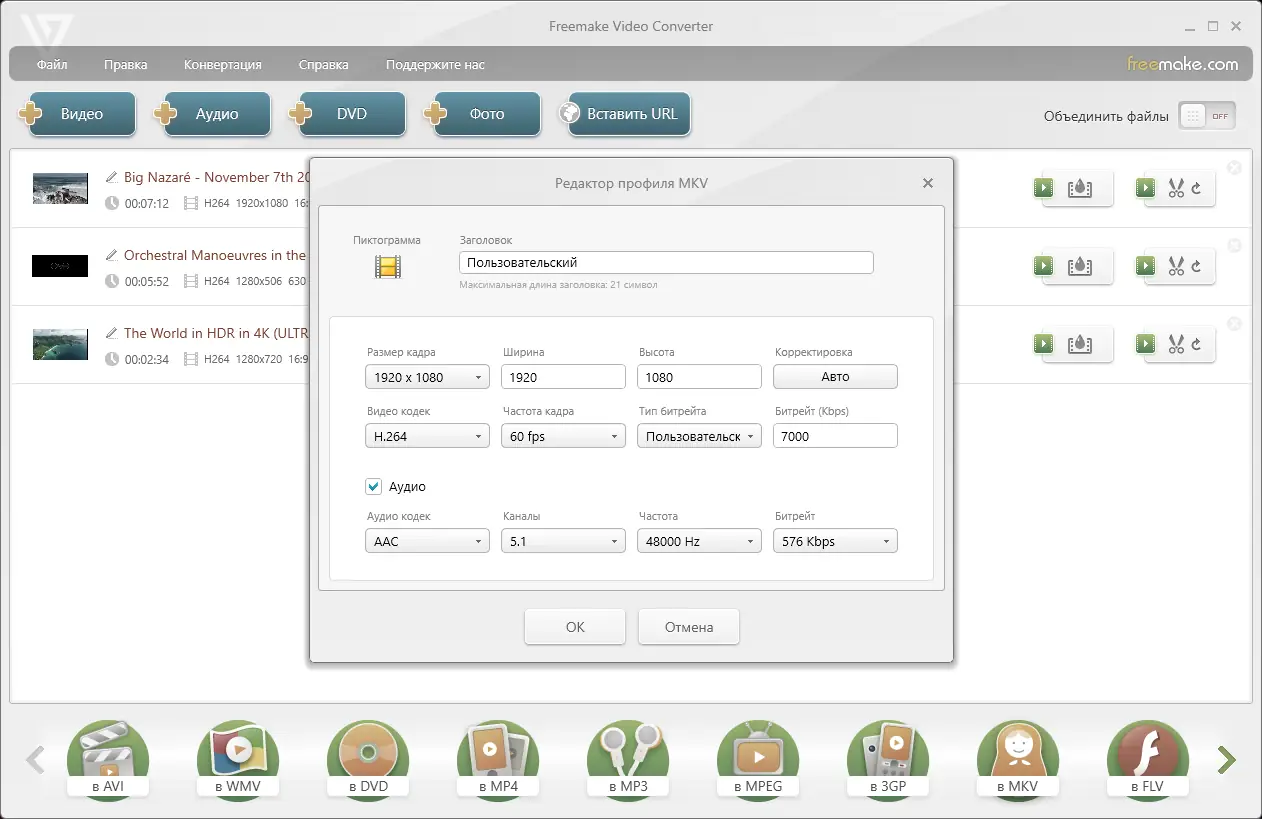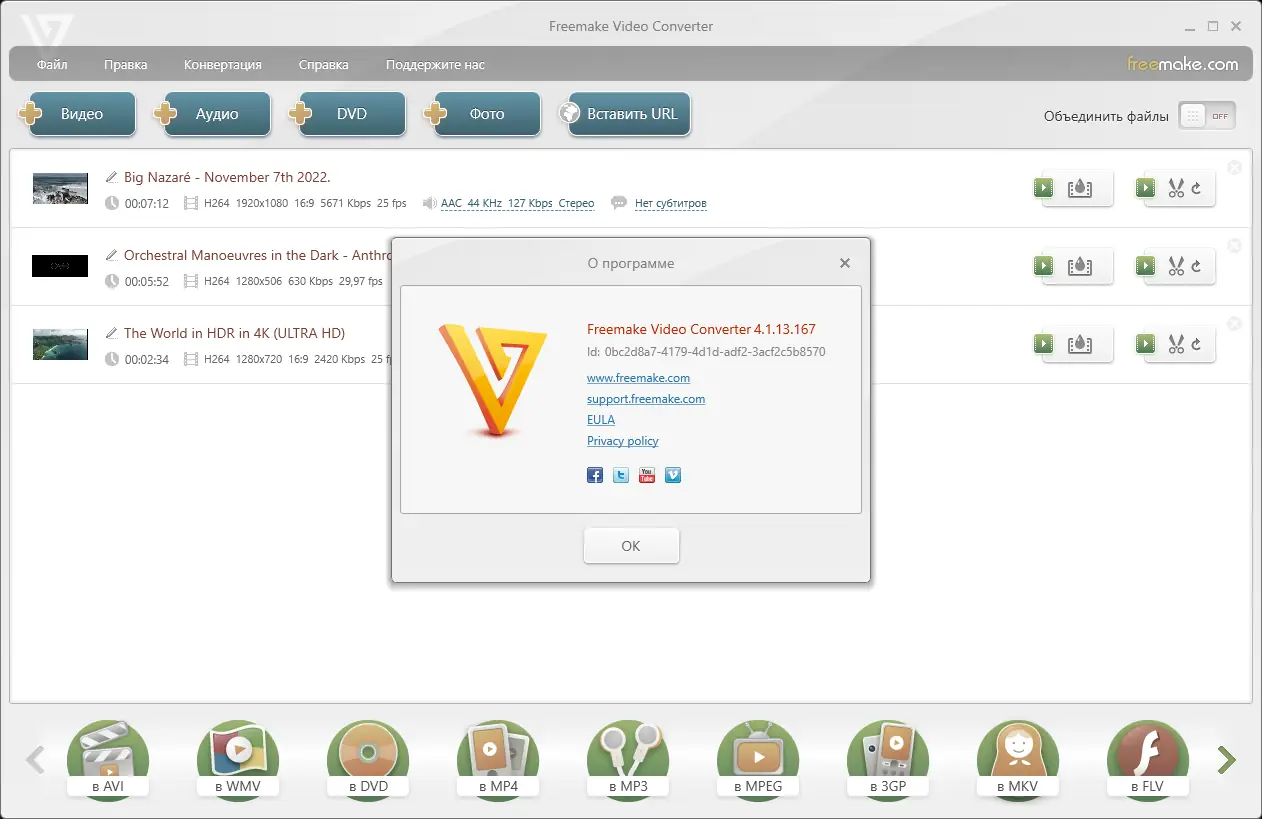 - Конвертация видео в более чем 500 форматов, включая MP4, AVI, MKV, MP3 и другие.