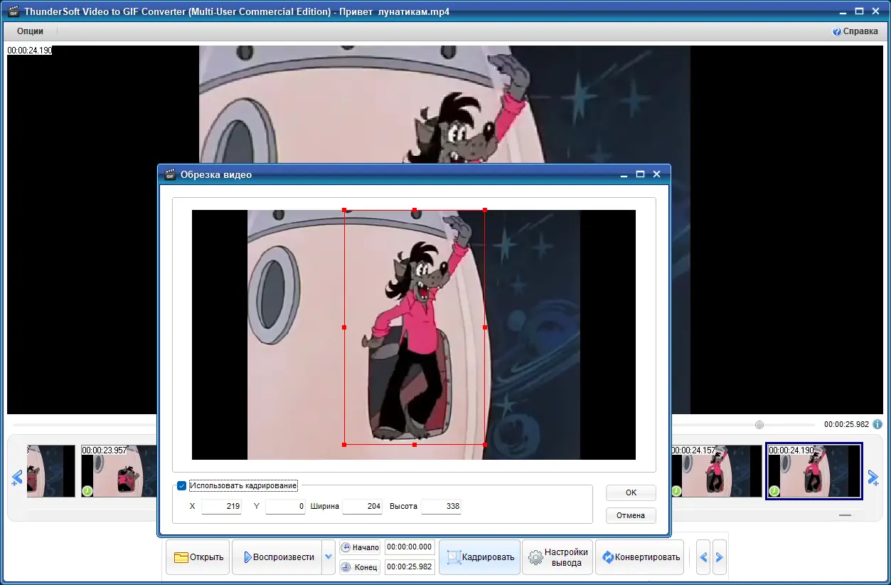 - Легкое кадрирование и точное указание видеоклипа для преобразования.
