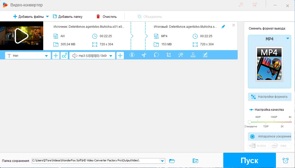 WonderFox HD Video Converter Factory — это универсальный конвертер видео, позволяющий преобразовать файлы в более чем 150 популярных HD и SD форматах. Встроенный редактор обеспечивает добавление эффектов, объединение, обрезку и пакетную обработку видеофайлов. Программа поддерживает преобразование видео под требования современных устройств и платформ, таких как iPad, iPhone, Samsung, Xbox и многие другие, а также обеспечивает высокое качество финальных файлов.