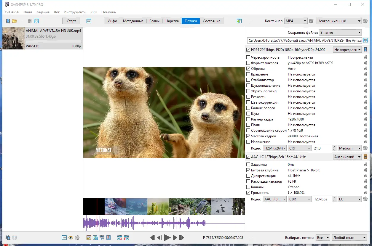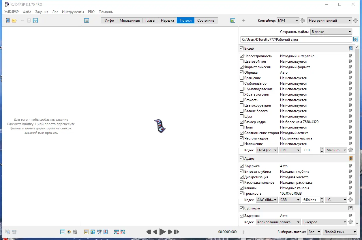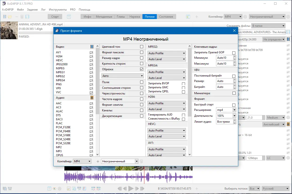 - Расширенные настройки кодеков, потоков, метаданных и фильтров, включая VFR и интерполяцию кадров.