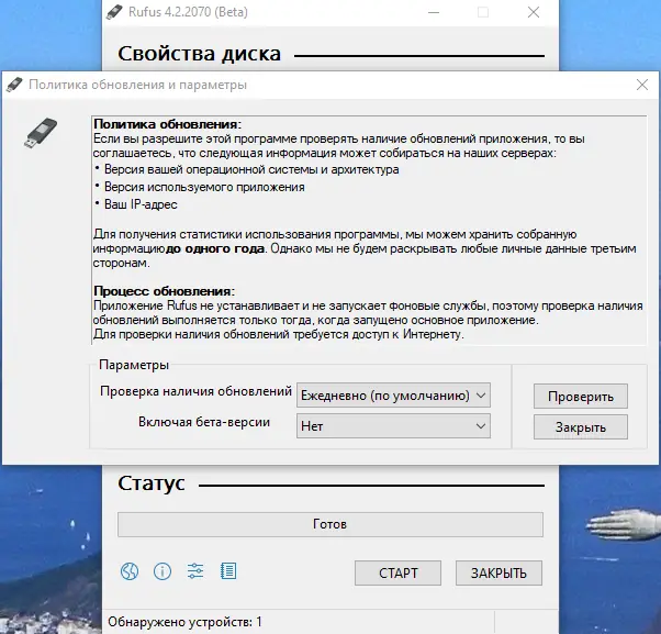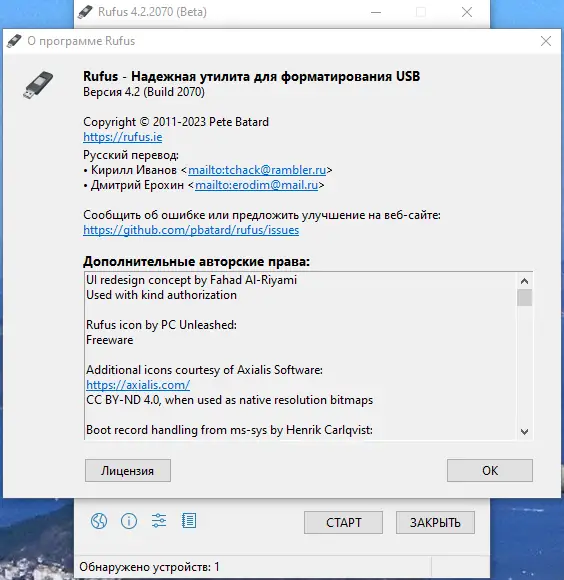 Поскольку утилита является портативной, её использование не требует инсталляции. Для начала работы достаточно скачать файл с официального сайта и запустить его. Перед началом убедитесь, что выбран правильный USB-носитель и ISO-образ для записи.