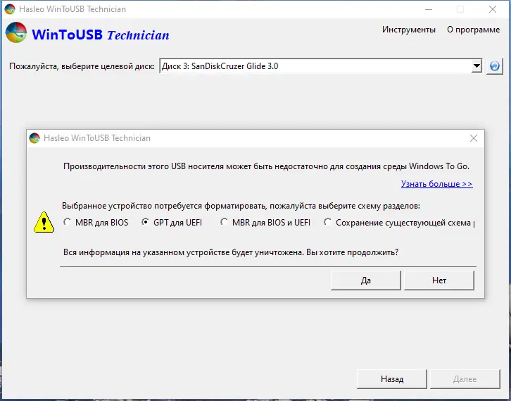 - Создание Windows To Go на любом USB-носителе, включая Несертифицированные устройства.