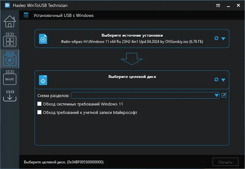 - Выберите источник установки (ISO, диск или VHD) и указите параметры раздела для установки системы.