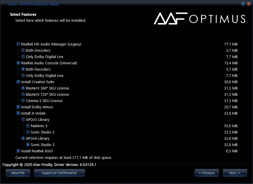 - Запустите установочный файл и выберите необходимые компоненты, такие как Realtek + Dolby Atmos или Realtek + Nahimic, сняв галочки с остальных.