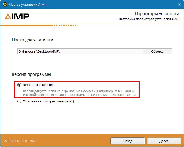 - При необходимости выберите портативную версию, поставив галочку «Переносная версия» во время установки.