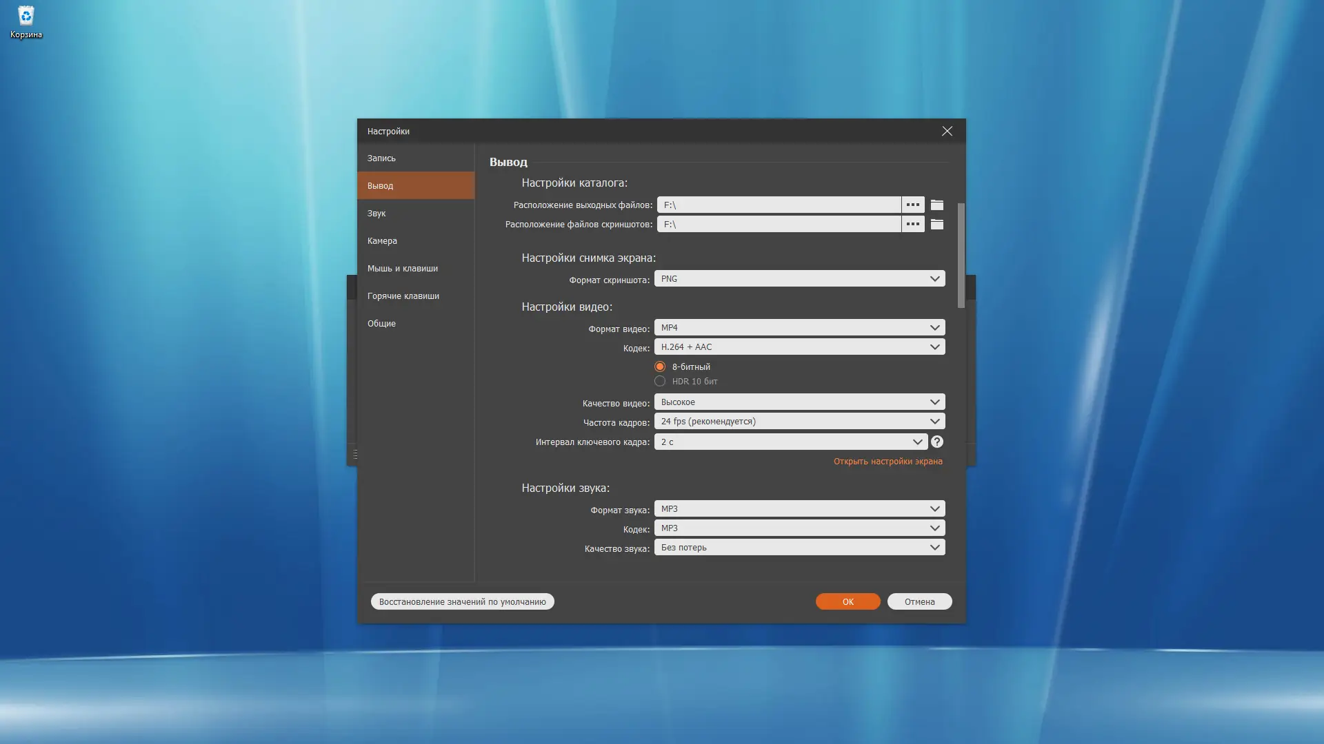 - Настройка параметров вывода, таких как качество, кодек, частота кадров, а также горячие клавиши для ускорения рабочего процесса.