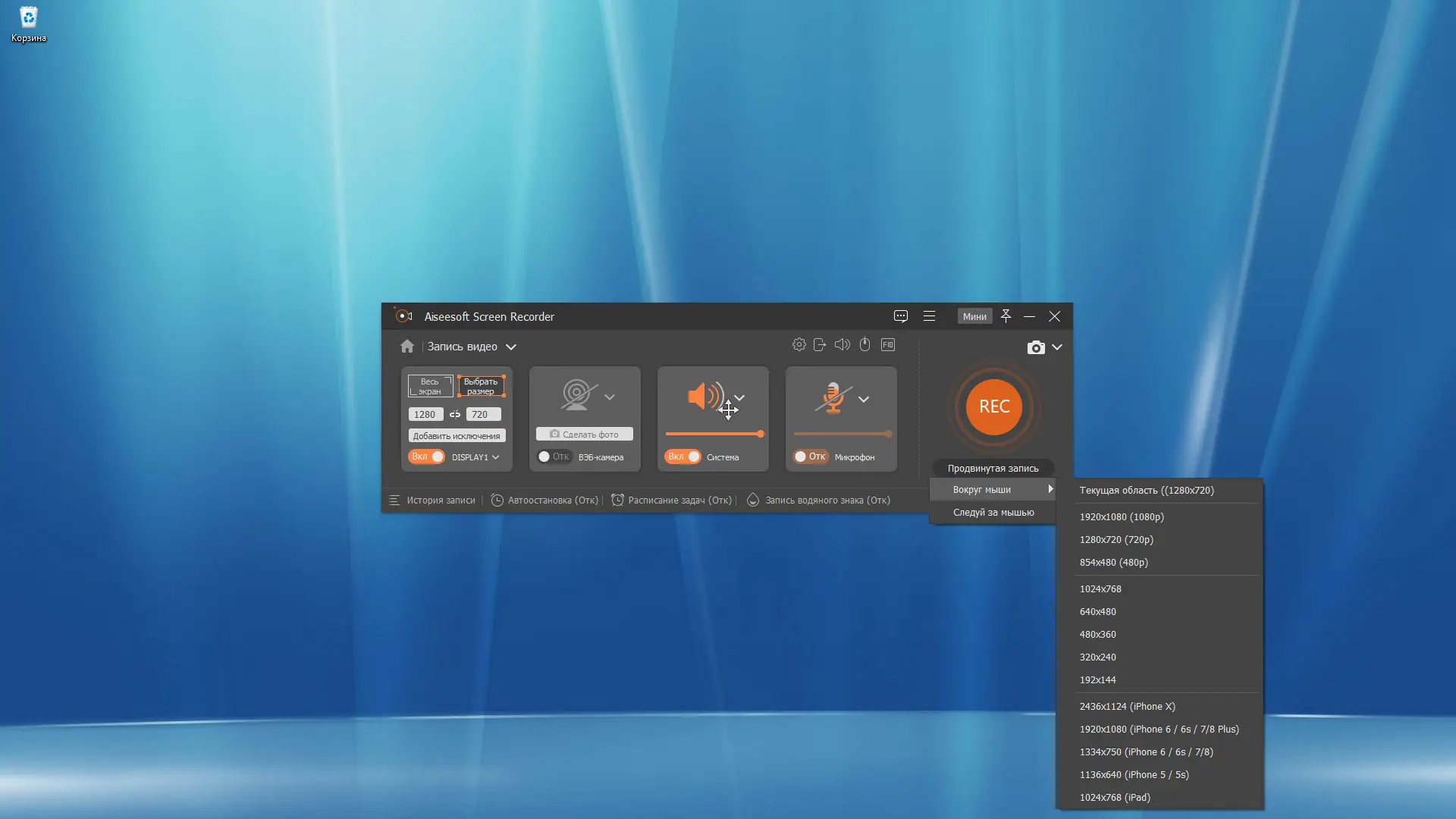- Запись видео с экрана в режимах полноэкранной и настройной области, с возможностью выделения движущегося курсора.