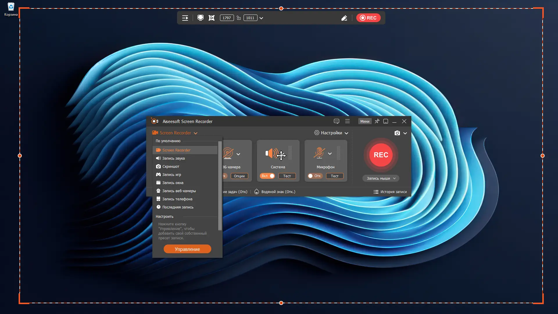 - Запись видео с любого экрана, включая полноэкранный режим и настраиваемую область.