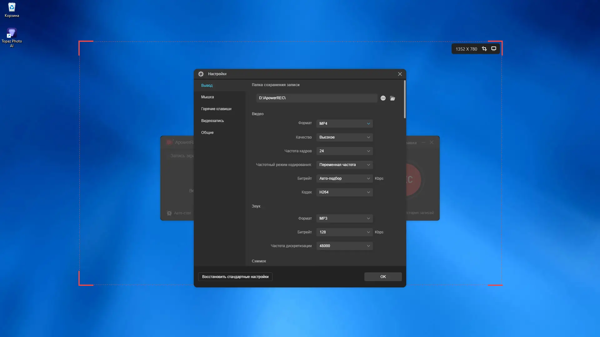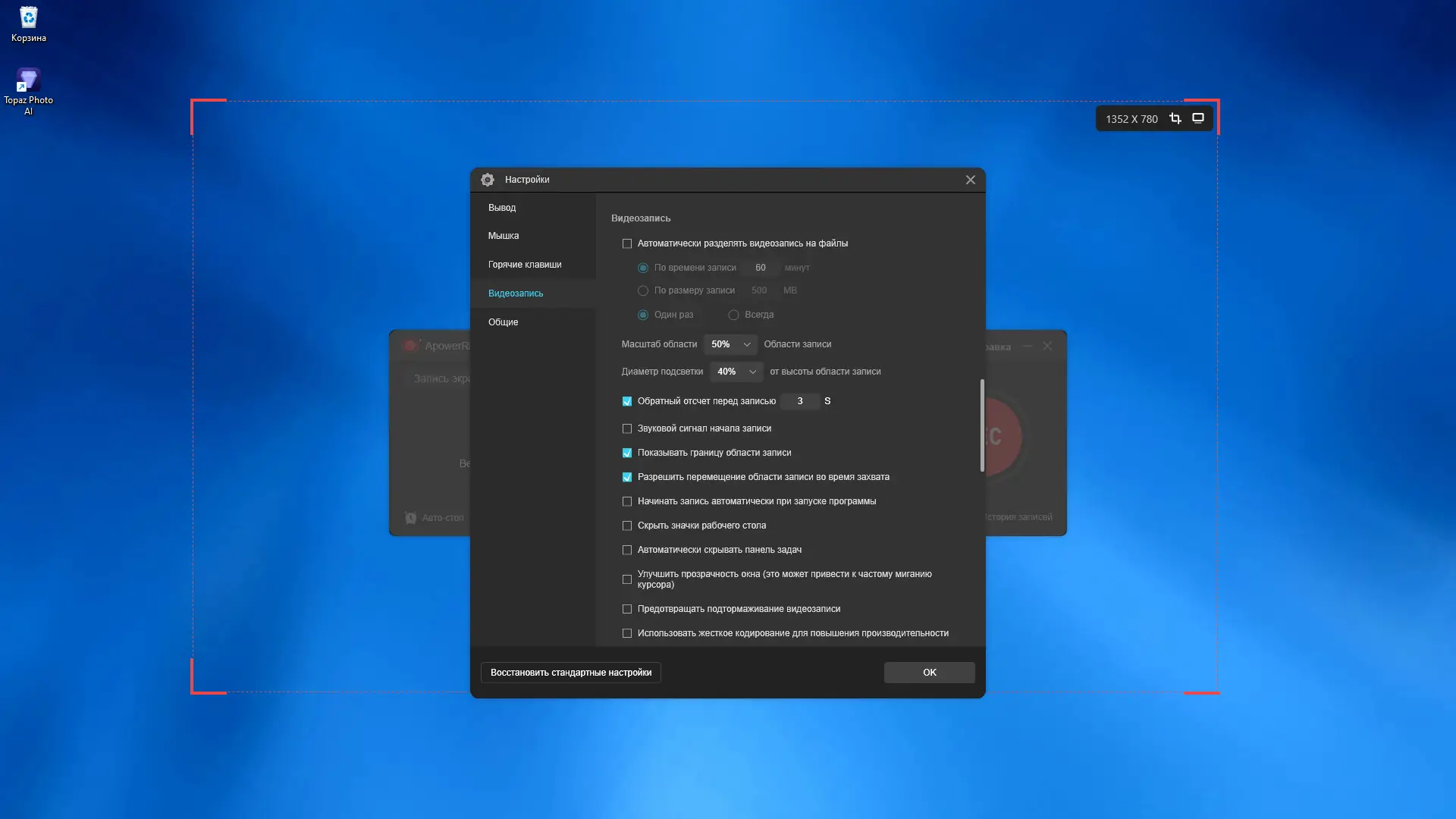 - Запись звука — регулировка громкости, выбор источника системы или микрофона для качественного звукового сопровождения.