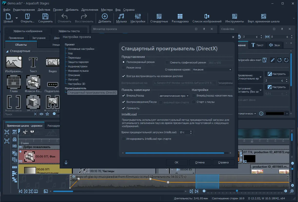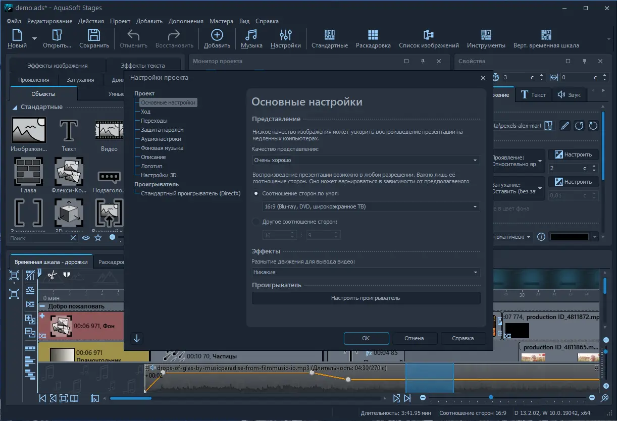 АquaSoft Stages представляет собой универсальный инструмент для создания высококачественных анимационных презентаций, включающий в свой арсенал более 100 визуальных эффектов. Программа подходит как профессионалам, так и опытным пользователям, желающим реализовать креативные идеи с помощью панорамного масштабирования, динамических масок, эффектов перехода и мощного видео кодировщика для форматов H.264 и H.265. Удобные инструменты позволяют синхронизировать фотографии с музыкой, добавлять комментарии, анимацию текста и объединять видео и звук в единую композицию, создавая незабываемые шоу и презентации.