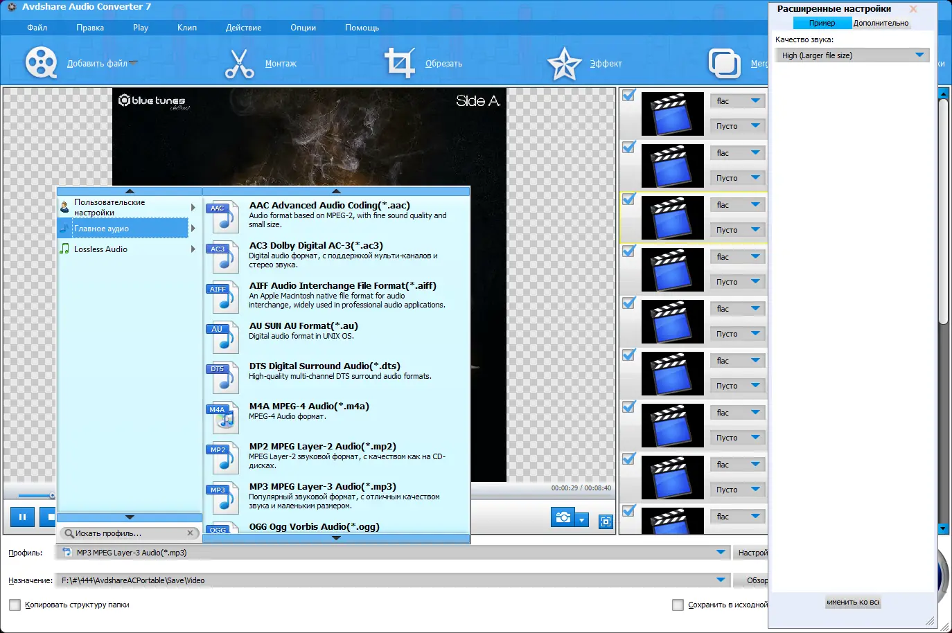 - Конвертирование аудио между всеми популярными форматами, включая MP3, WMA, M4A, AAC, AC3, WAV, OGG и др.