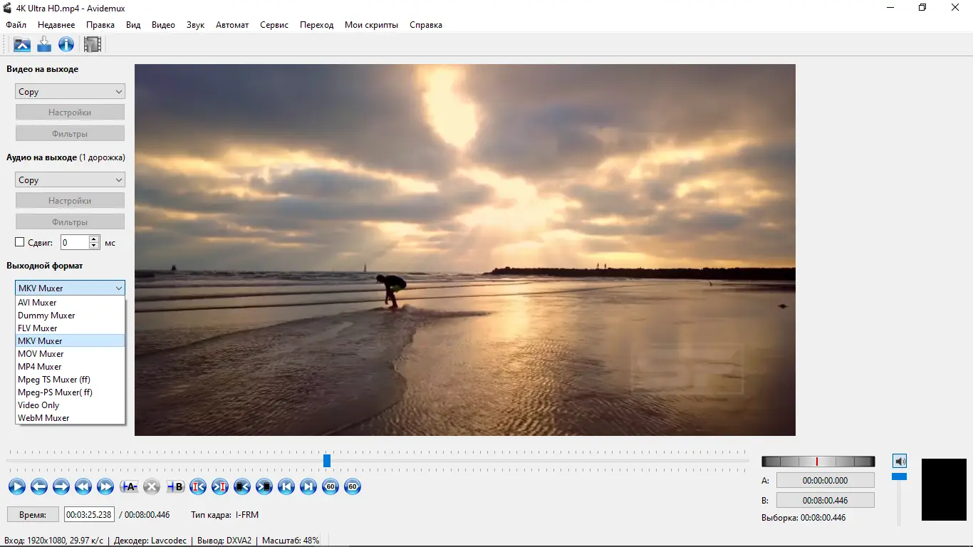 Программа Avidemux представляет собой небольшой, но функциональный редактор видео, который подходит для обработки и редактирования видеофайлов в домашних условиях. Она позволяет как выполнять базовые операции: вырезание, соединение, изменение размера кадра, так и применять различные фильтры для улучшения изображения и звука. Благодаря встроенной поддержке популярных видеоформатов, таких как AVI, MP4, MKV, MPEG, а также множеству поддерживаемых кодеков, программа обеспечивает широкий спектр задач без необходимости установки дополнительных кодеков или модулей. Ее интерфейс интуитивно понятен, а работа осуществляется как через графический интерфейс, так и командную строку, что делает ее удобной для автоматизации процессов.