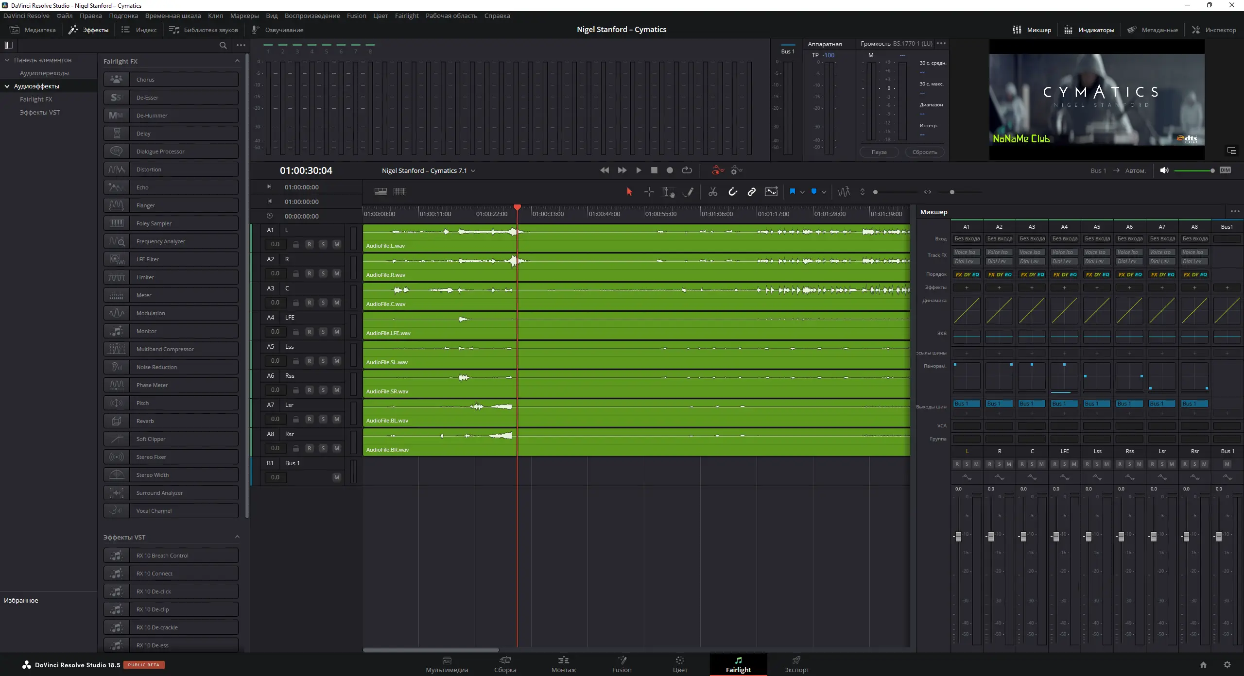- Обработка звука на платформе Fairlight с поддержкой до 2000 треков, расширенными эффектами и возможностью работы в формате Dolby Atmos и SMPTE ST.2098.