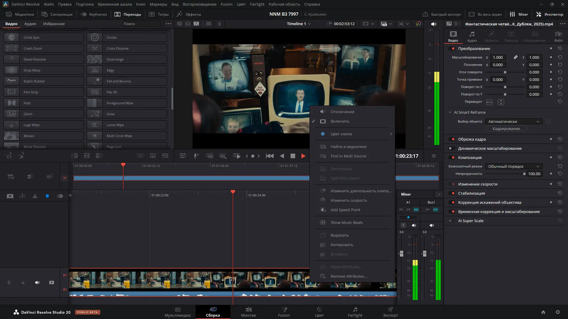 - Объединение в одной платформе различных этапов работы: монтаж, цветокоррекция, VFX, звук.