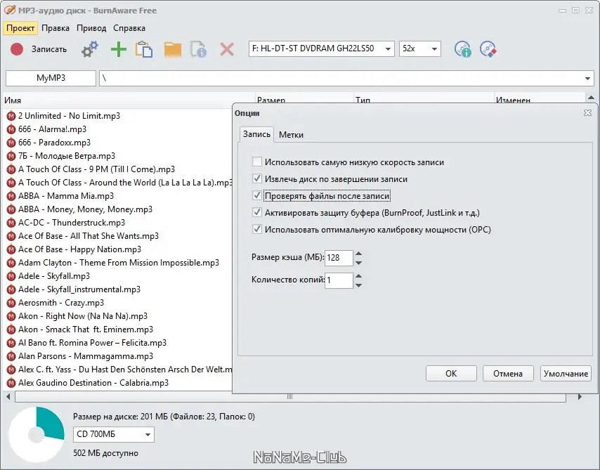 - Запись аудио CD из форматов WAV, MP3 или WMA