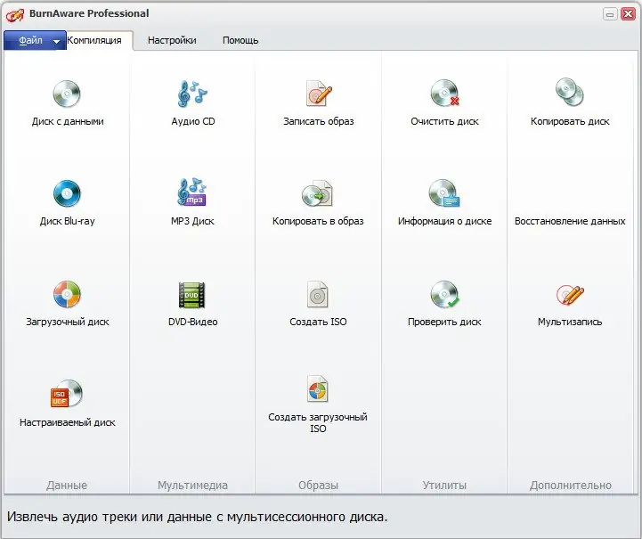 - Запись с любых типов носителей CD/DVD и Blu-Ray (BD-R/BD-RE)