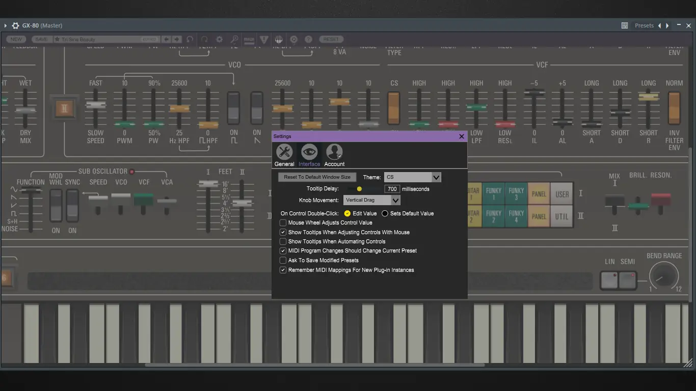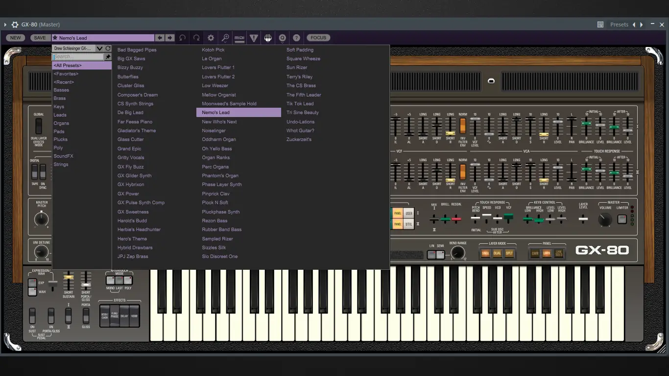 GX-80 — уникальный виртуальный инструмент, который не ограничивается классической эмуляцией CS-80. Он интегрирует ключевые функции и архитектурные особенности GX-1, создавая мощный и гибкий синтезатор с двуслойной полифонией и богатым диапазоном звуковых возможностей. GX-80 способен воспроизводить легендарные тембры благодаря искусственному воспроизведению фильтра GX-1, что обеспечивает насыщенность и изысканность звучания. Инструмент включает в себя высокочастотные резонансные импульсы, полосовые пилообразные и треугольные волны, а также инверсию огибающей фильтра, открывающие новые горизонты экспериментов с звуком.