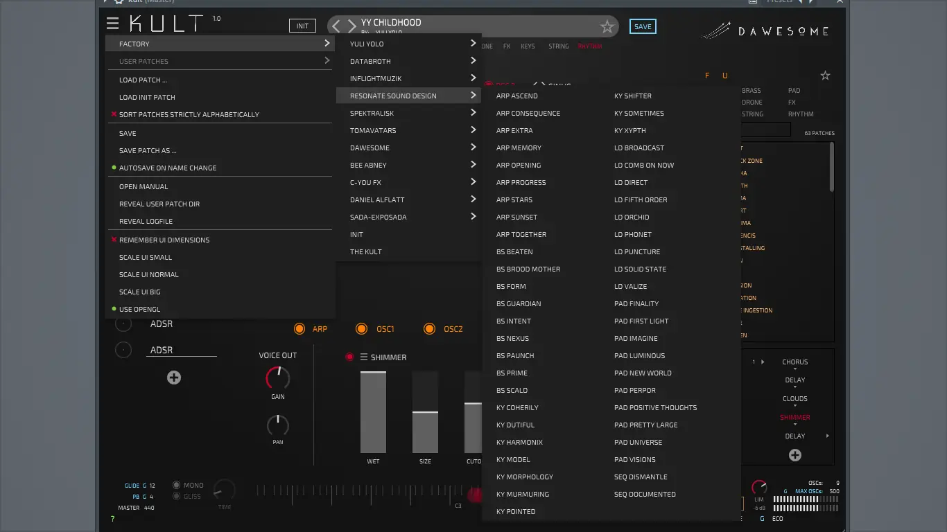 Раздвигая границы технологий и синтеза, Dawesome — Kult создает завораживающие, уникальные синтезаторные звуки. От теплых и мягких тонах до холодных и твердых, от знакомого к чужому, он предлагает живое звуковое пространство, полное возможностей. Использование двух мощных осцилляторов, основанных на математической теории хаоса «Странные аттракторы», позволяет создавать органичные, хаотически скульптурированные обертоны, идеально подходящие для экспериментов в стиле западного побережья.