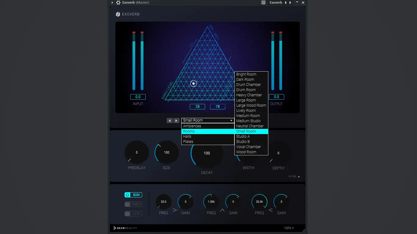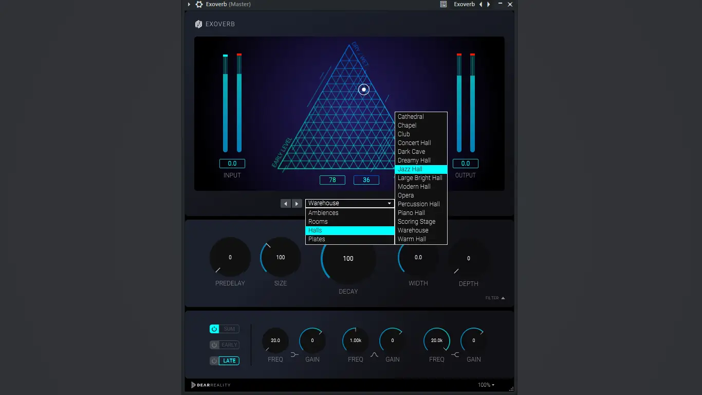 Программа Dear Reality — Exoverb предлагает 50 реализуемых сцен звучания – от амбиентов и помещений до акустических пространств и пластин. Высокоточная пространственная обработка позволяет точно ощущать расстояние и объем источника, а уникальный треугольный пэд дает возможность одновременно регулирувать соотношение сухого и обработанного сигнала, а также создавать идеальный баланс между ранними отражениями и основной реверберацией. Возможности настройки включают регулировки предзадержки, размера, времени затухания, ширины и глубины сцены, а также отдельные эквалайзеры для тональной коррекции характеристик каждого компонента реверберации.
