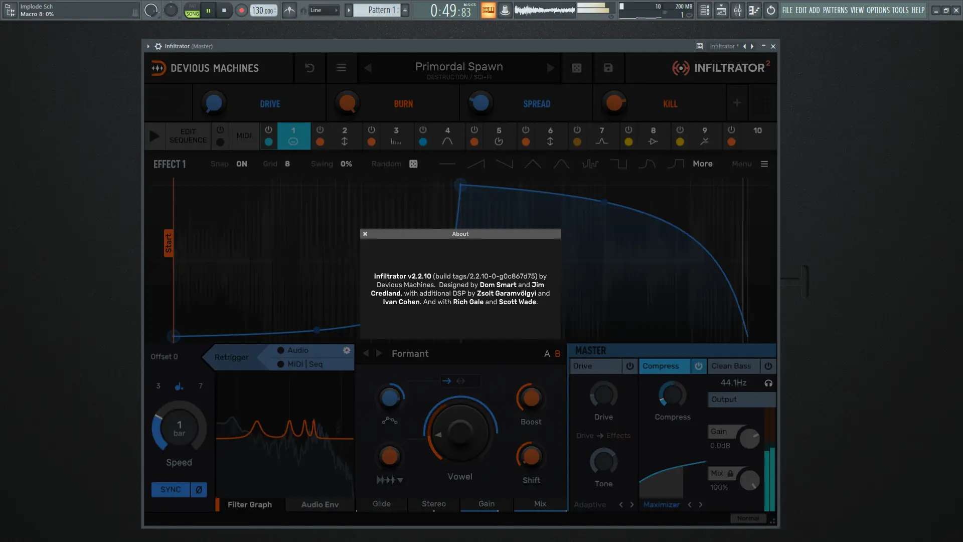 Infiltrator 2 расширяет оригинальную версию, удваивая число эффектов, пресетов и возможностей модуляции. В этом плагине собрано 54 различных процессора эффектов, включая моделированные фильтры, дисторшны, спектральные манипуляции, реверберацию, задержки, модуляцию и многое другое. Каждый эффект сопровождается двумя многосегментными огибающими, синхронизированными по темпу, что позволяет точно управлять параметрами и создавать сложные ритмические паттерны. Модули можно включать и выключать с помощью встроенного секвенсора, что даёт возможность создавать динамические и насыщенные ритмические сценарии.