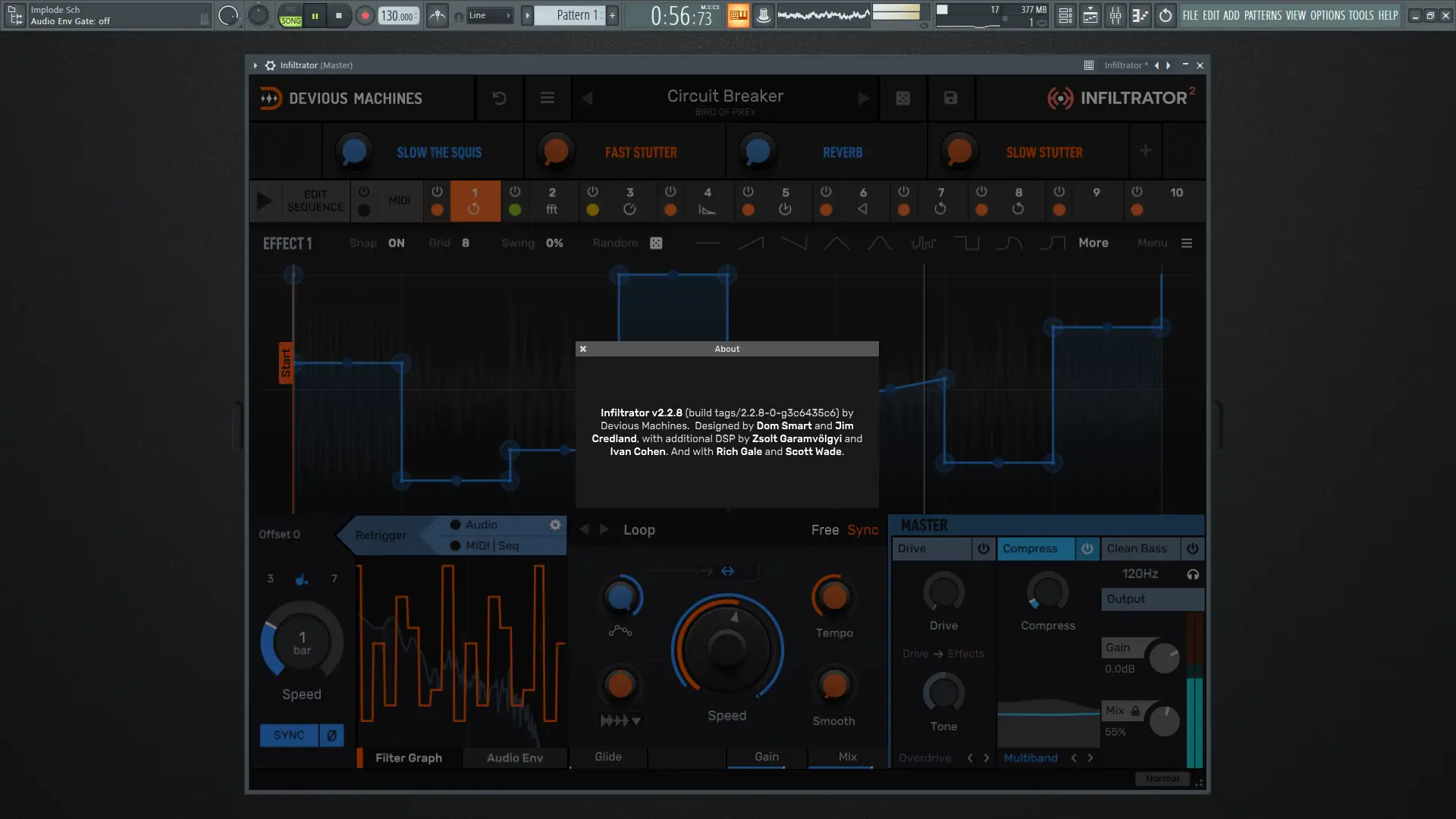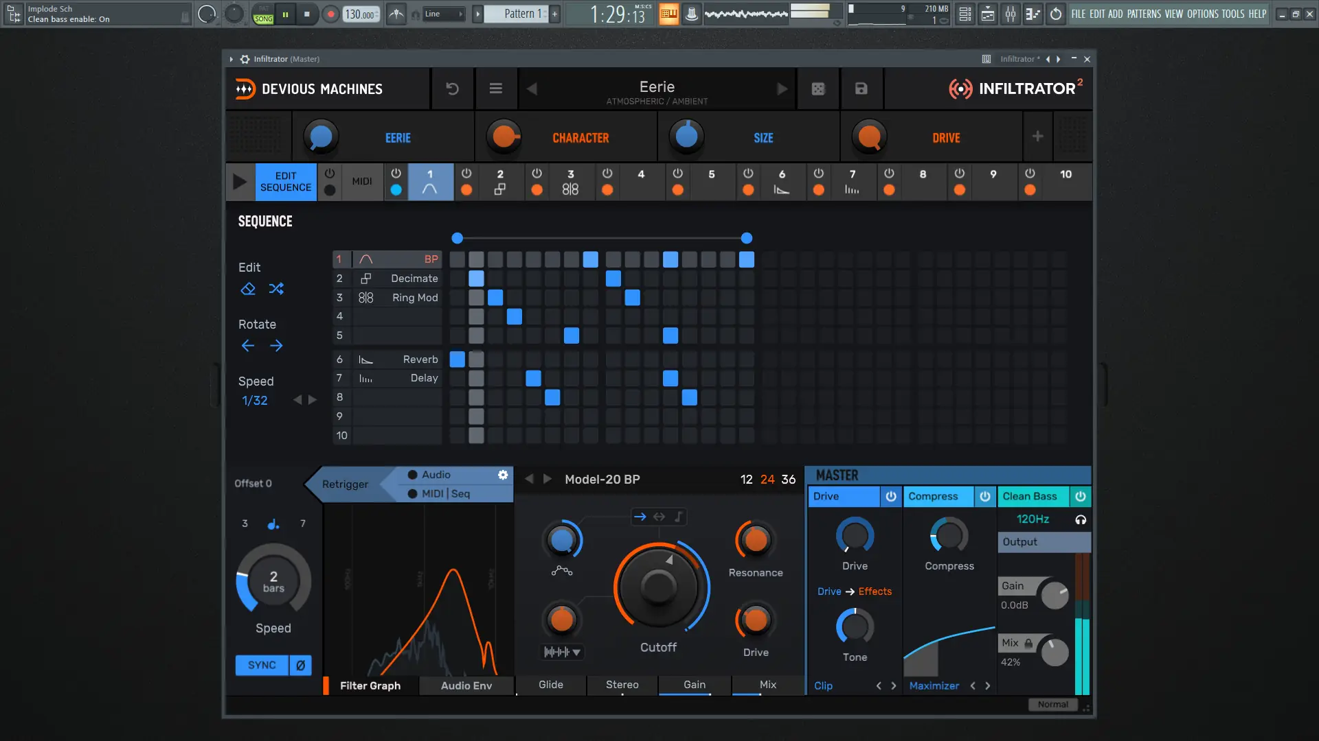 Также присутствуют инструменты генерации случайных паттернов, евклидовых ритмов, свинга и привязки высоты тона, что предоставляет широкие возможности для творчества и экспериментов. Возможность комбинировать эффекты и модулировать их параметры делает Infiltrator непревзойденным средством для создания уникальных звуковых эффектов и звучаний.