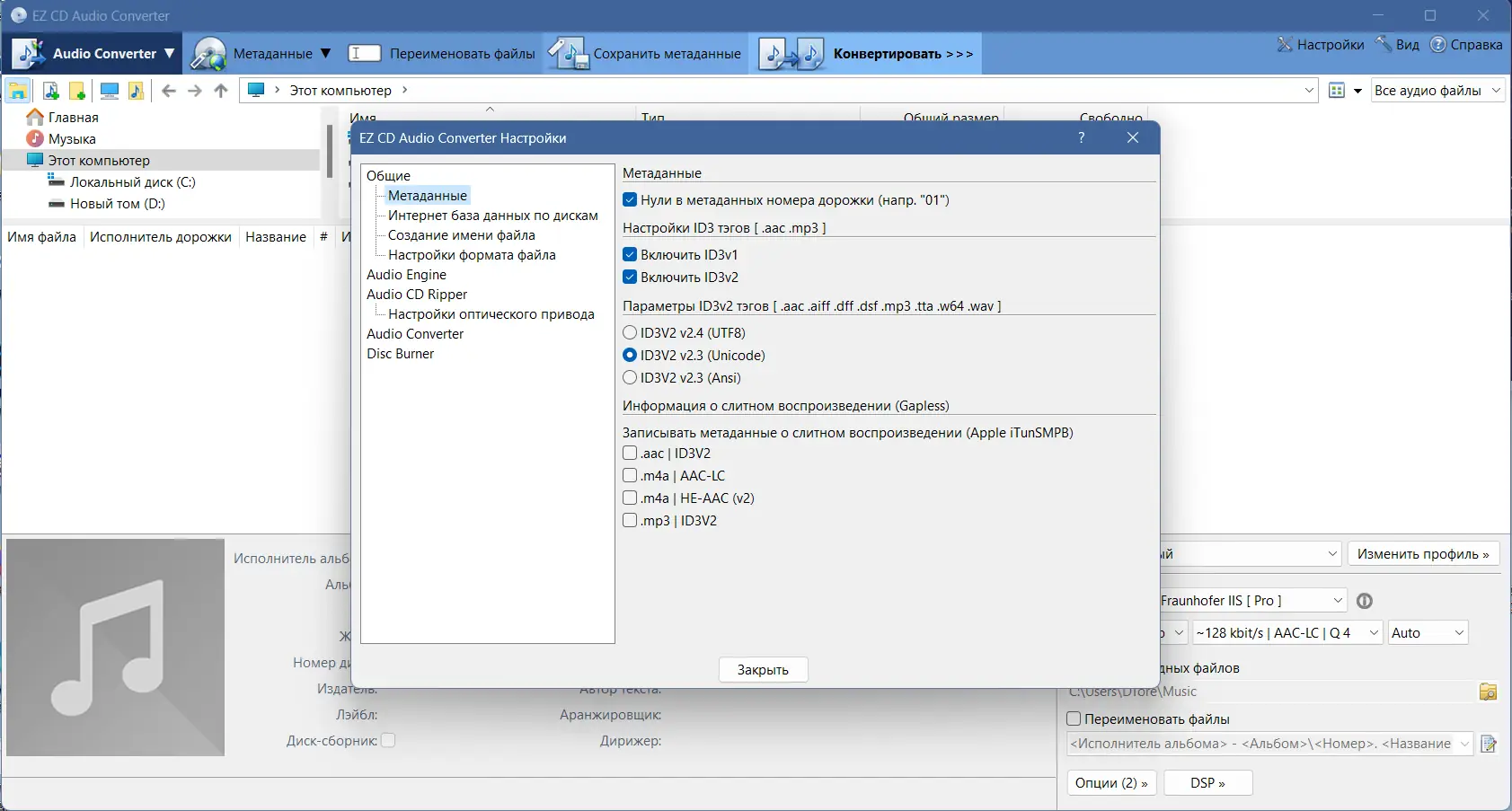 EZ CD Audio Converter — это универсальная утилита для преобразования аудио-CD в качественные цифровые форматы, а также для записи и конвертации аудиофайлов. Она поддерживает работу с множеством популярных форматов, таких как MP3, WAV, FLAC, AAC, Ogg Vorbis и Monkey’s Audio. Программа обладает высоким уровнем производительности и стабильности, позволяя создавать копии дисков, редактировать метаданные, работать с защищенными и поврежденными носителями, а также обеспечивать качественное преобразование аудио. Интуитивный интерфейс и мультиязычная поддержка, включая русский язык, делают использование максимально удобным для различных категорий пользователей.