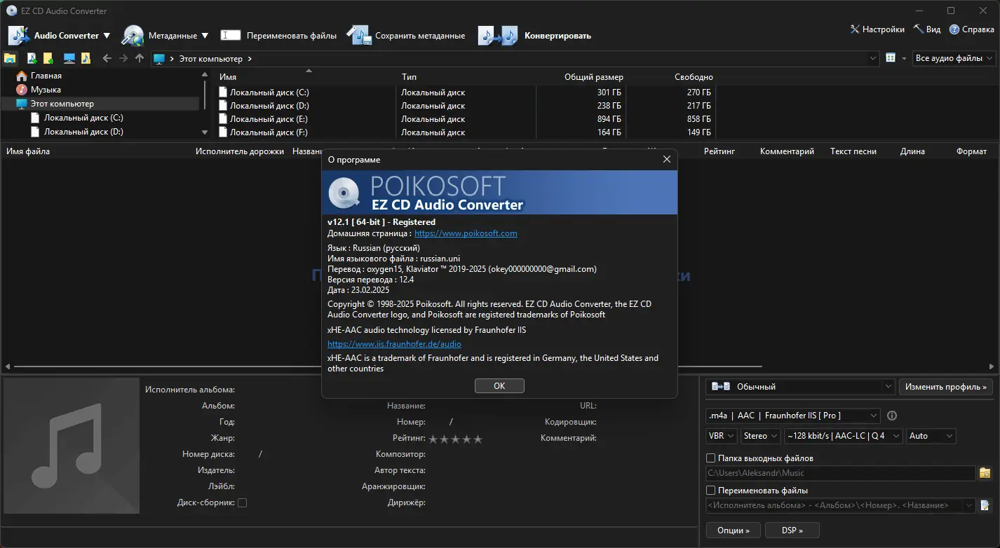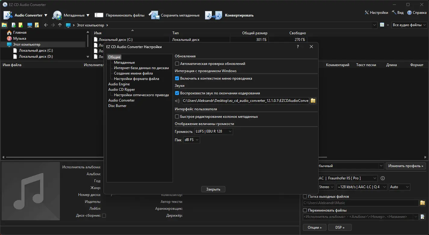 EZ CD Audio Converter — мощная утилита для преобразования аудио-CD в качественные цифровые файлы и для записи различных аудиоформатов на диски. Программа поддерживает работу с многочисленными форматами, включая MP3, WAV, FLAC, Ogg Vorbis, AAC, Monkey’s Audio и др., а также позволяет непосредственно преобразовывать аудиотреки. Ее интерфейс мультиязычный, с поддержкой русского языка, а высокая производительность достигается за счет оптимизации с помощью современных инструкций и технологий. Встроенные функции позволяют извлекать сведения о диске из базы freedb, редактировать теги, нормализовать уровень громкости и удалять паузы, обеспечивая гибкое управление аудиоконтентом.