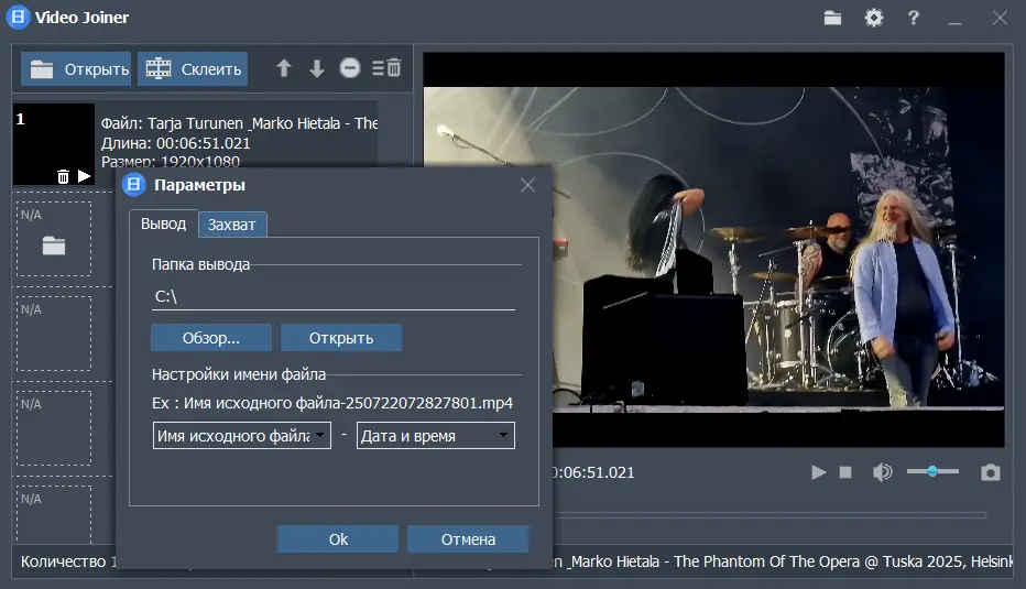 - Поддержка файлов в различных форматах и поточный просмотр объединённых видеофайлов.