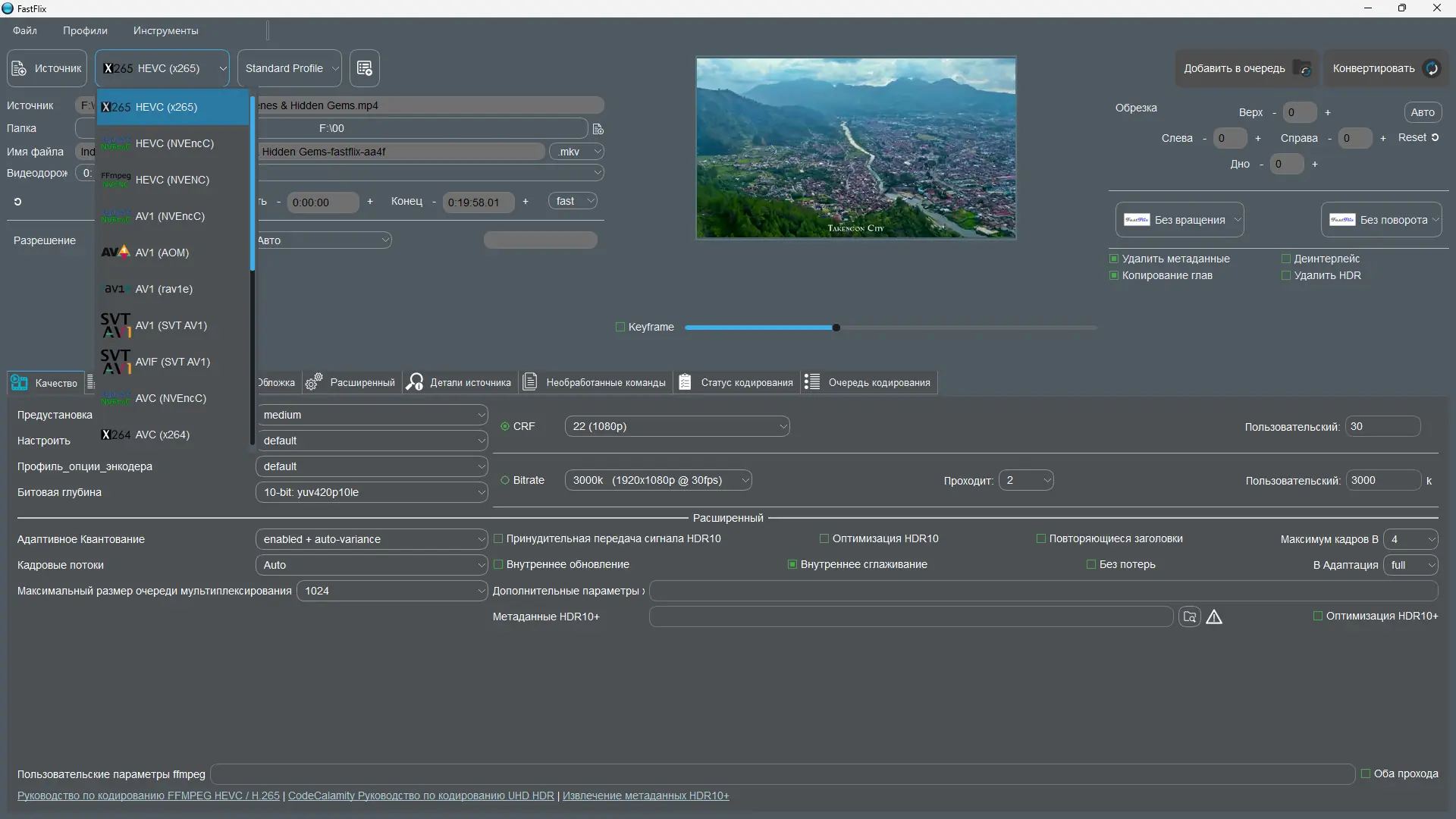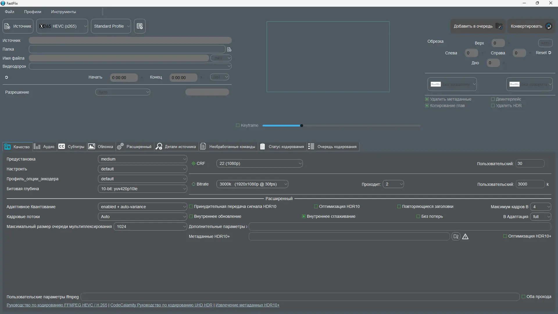 FastFlix — это удобный и дружелюбный графический интерфейс для кодирования видеофайлов, позволяющий легко управлять параметрами сжатия и метаданными. Программа ориентирована на пользователей, желающих быстро и эффективно конвертировать видео с сохранением HDR10 и расширением возможностей для формата AV1 в будущем.