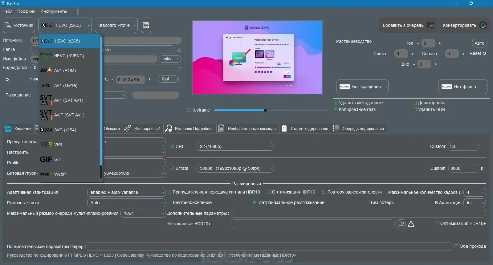- Настройка параметров кодека, битрейта, глубины цвета и профилей