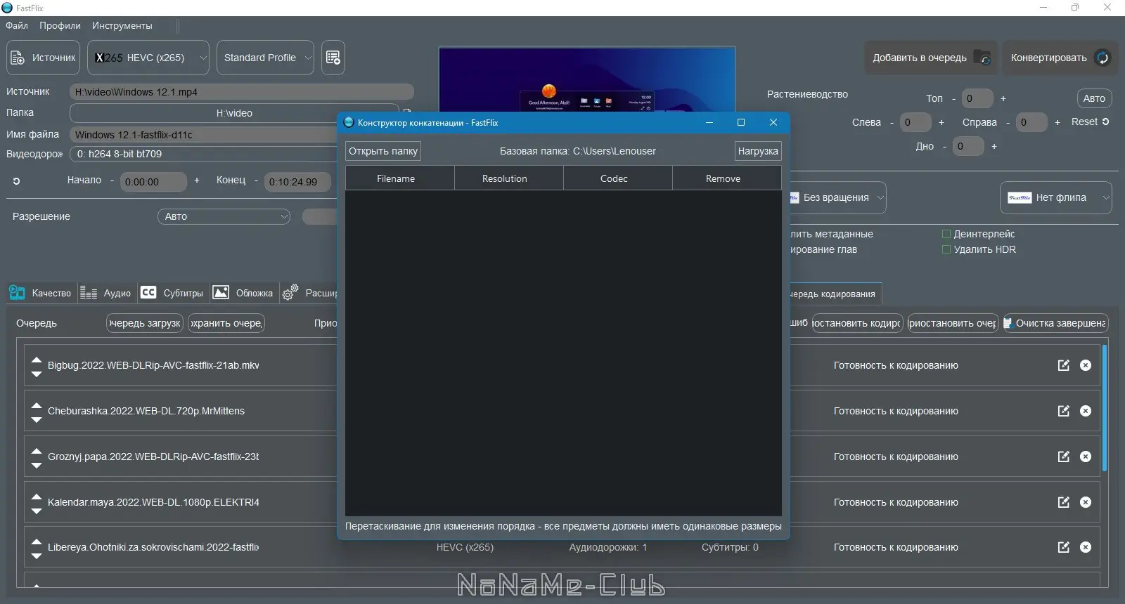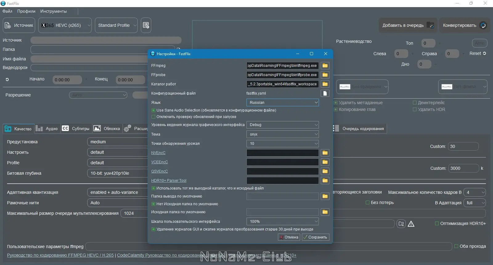 FastFlix предоставляет пользователям интуитивный интерфейс для обработки видеофайлов, позволяя сохранять метаданные HDR10 при использовании кодеков x265, NVEncC HEVC и VCEEncC HEVC. В будущем появится поддержка кодека AV1. Для работы требуется установленный FFmpeg (версия 4.3 или выше), который программа предложит загрузить при первом запуске. После установки вы сможете управлять параметрами кодирования, такими как битрейт, глубина цвета, CRF, число кадров, а также выбирать тип кодека и применять расширенные настройки.