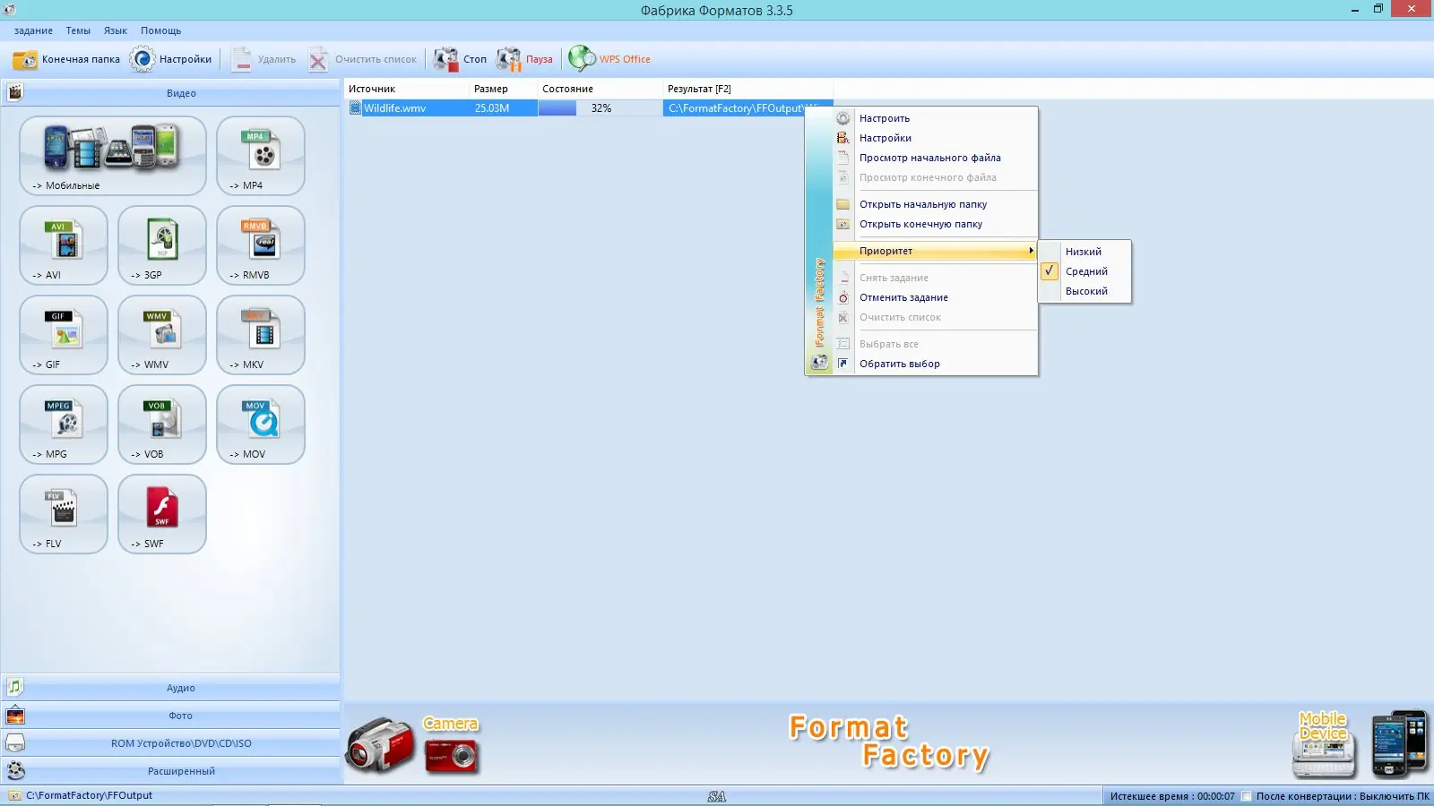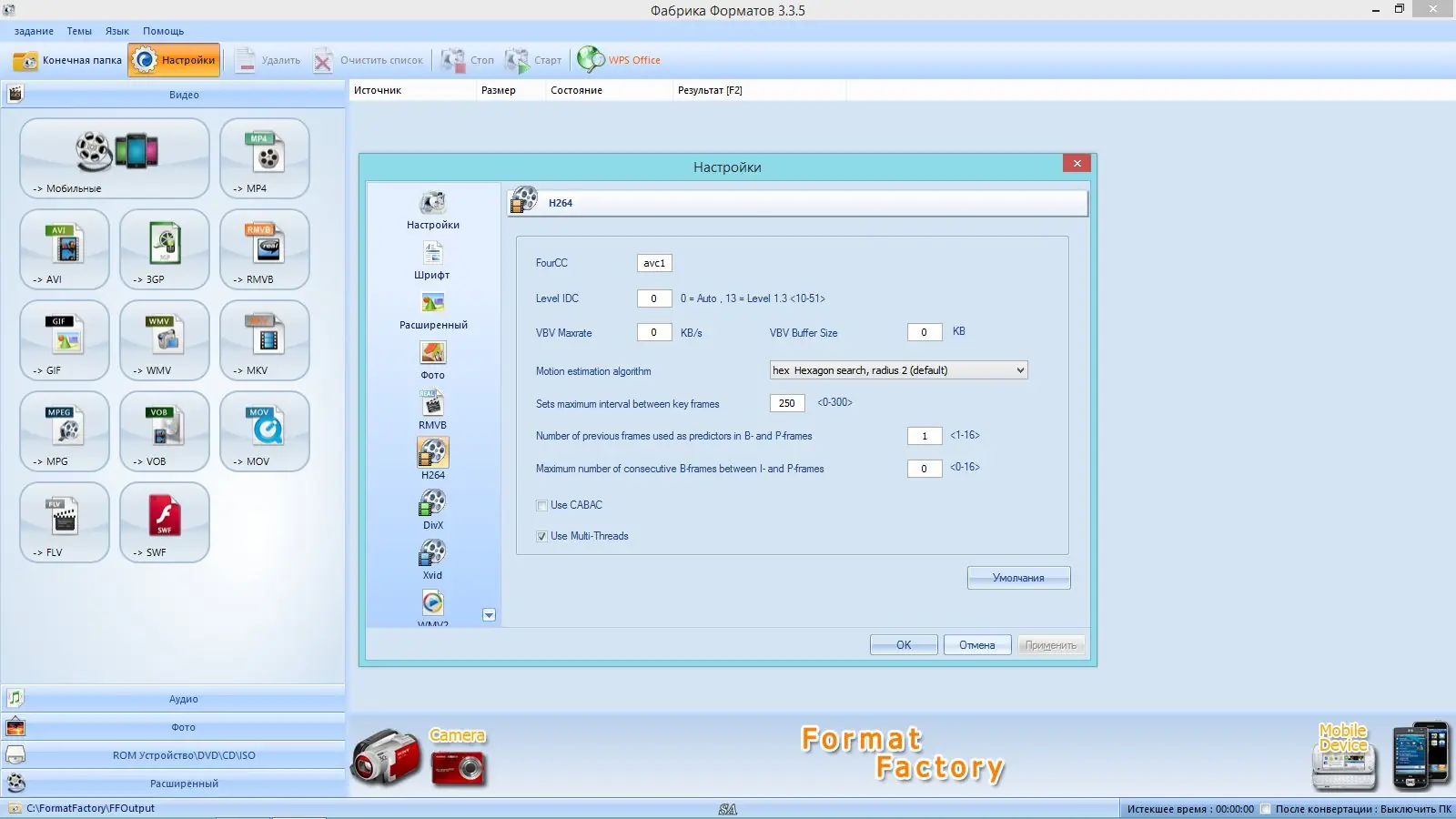 - Конвертация популярных видеоформатов в MP4, 3GP, MPG, AVI, WMV, FLV и SWF