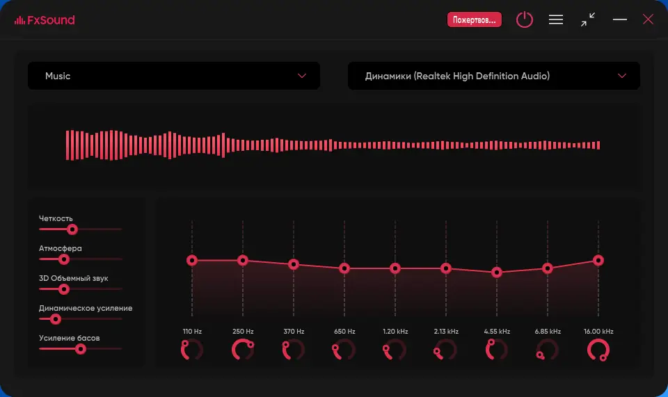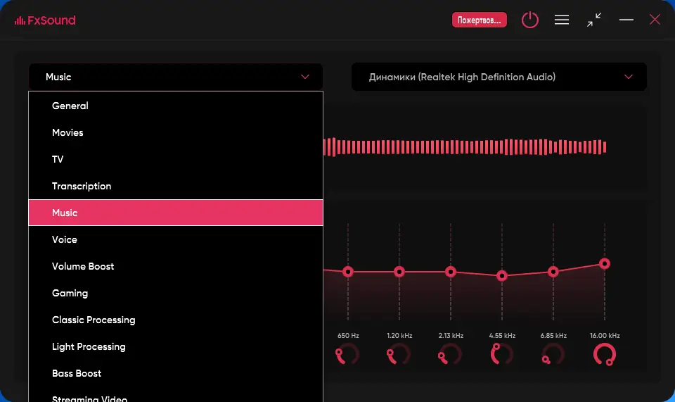FxSound (ранее DFX Audio Enhancer) — это универсальное решение для изменения звука в режиме реального времени. Его функционал включает настройку параметров аудиосигнала с помощью встроенного эквалайзера, режима глубокого звучания и супербаса, а также создание пресетов под различные сценарии использования: музыку, игры, стриминговое видео и другие. Благодаря интуитивно понятному интерфейсу, программа обеспечивает высокую точность воспроизведения, восстановление глубины стерео и создание объемного 3D звучания. Пользователи могут увеличить громкость без потери качества, адаптировать звук под свои предпочтения и улучшить звучание в органичном диапазоне устройств и приложений, включая YouTube, Netflix, Pandora и многие другие.