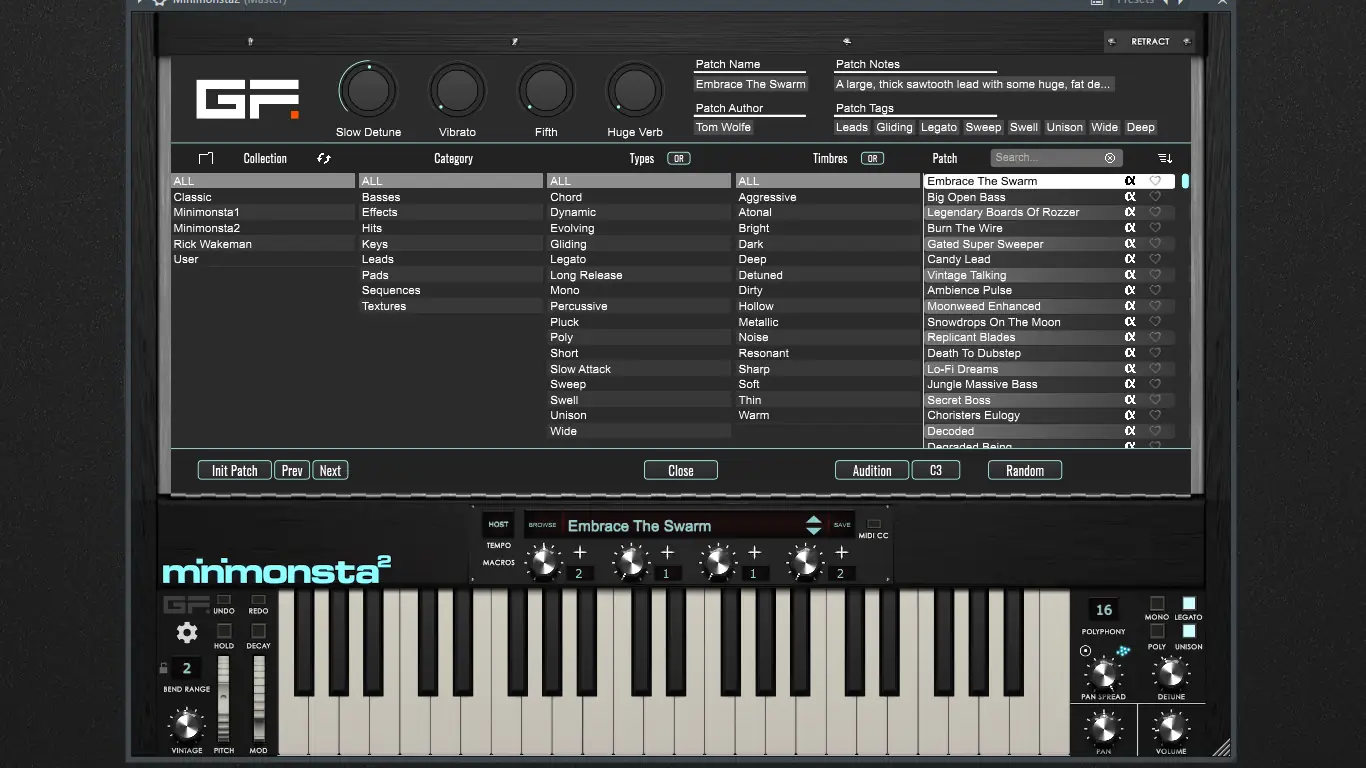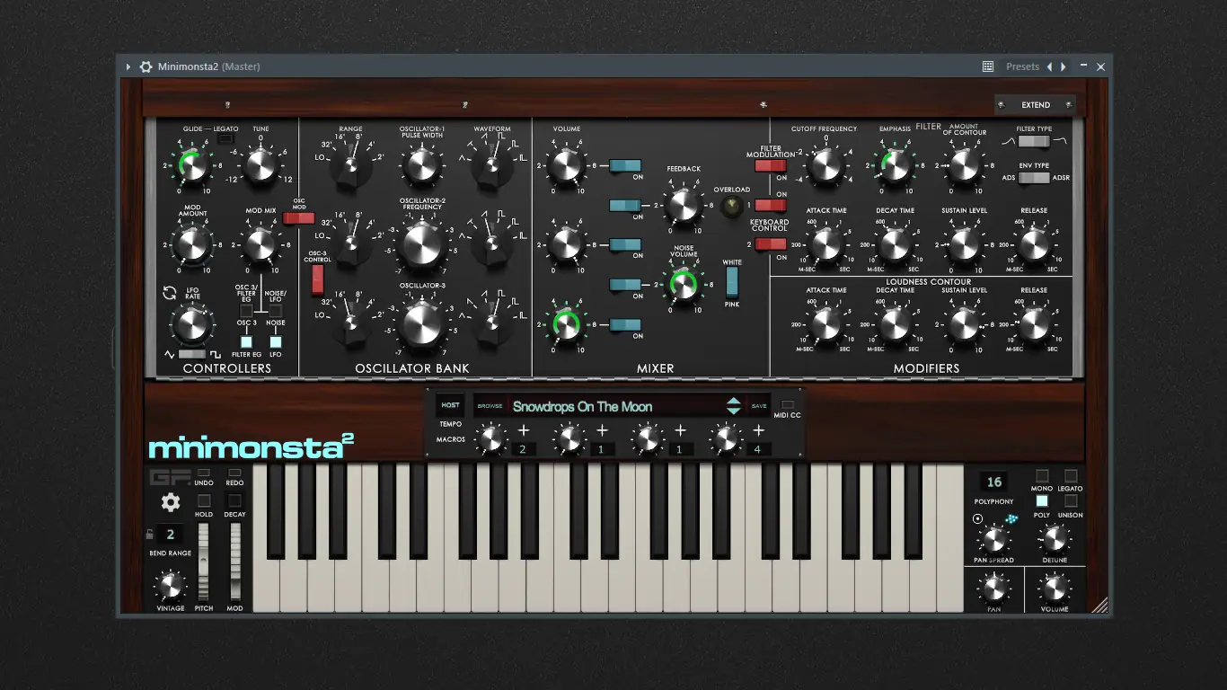 Minimonsta2 — обновленная версия популярного виртуального синтезатора, основанная на модели легендарного D®. Этот плагин был создан для тех, кто ценит точное звучание классических аналоговых устройств, а также стремится расширить свои музыкальные возможности за счет новых функций и интерфейса.