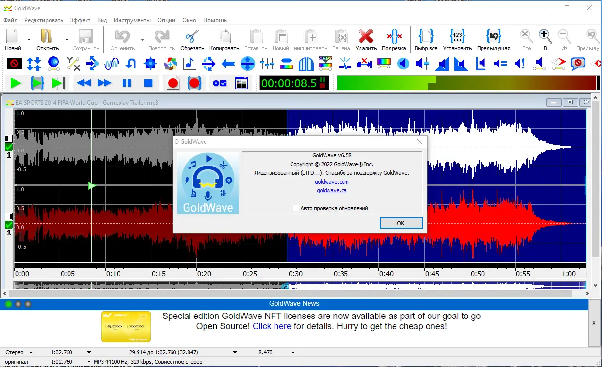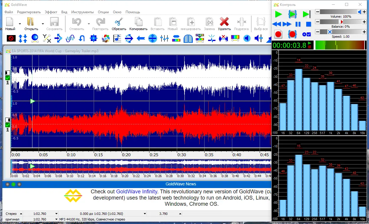 GoldWave — мощный аудио редактор, предназначенный для профессионального и любительского использования. Он позволяет проигрывать, редактировать, микшировать и анализировать звуковые файлы, работая с большими файлами быстро и эффективно.
