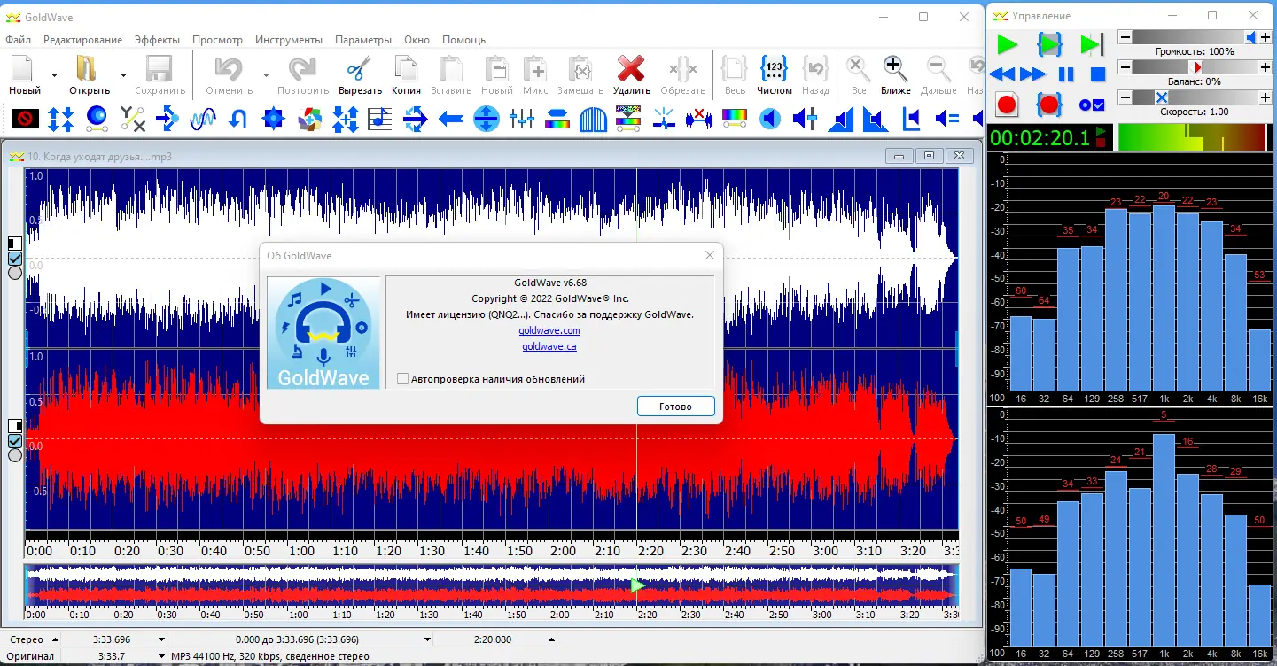GoldWave — мощный аудиоредактор, предназначенный для профессионального и любительского редактирования звука. Обеспечивает широкий функционал по обработке, воспроизведению и конвертации аудиофайлов различных форматов, а также позволяет осуществлять качественную реставрацию и восстановление записей.