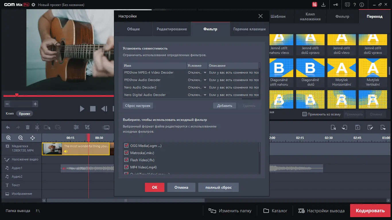 - Использование 45 фильтров и 25 эффектов переходов для динамичных смен сцен и профессионального оформления видео.