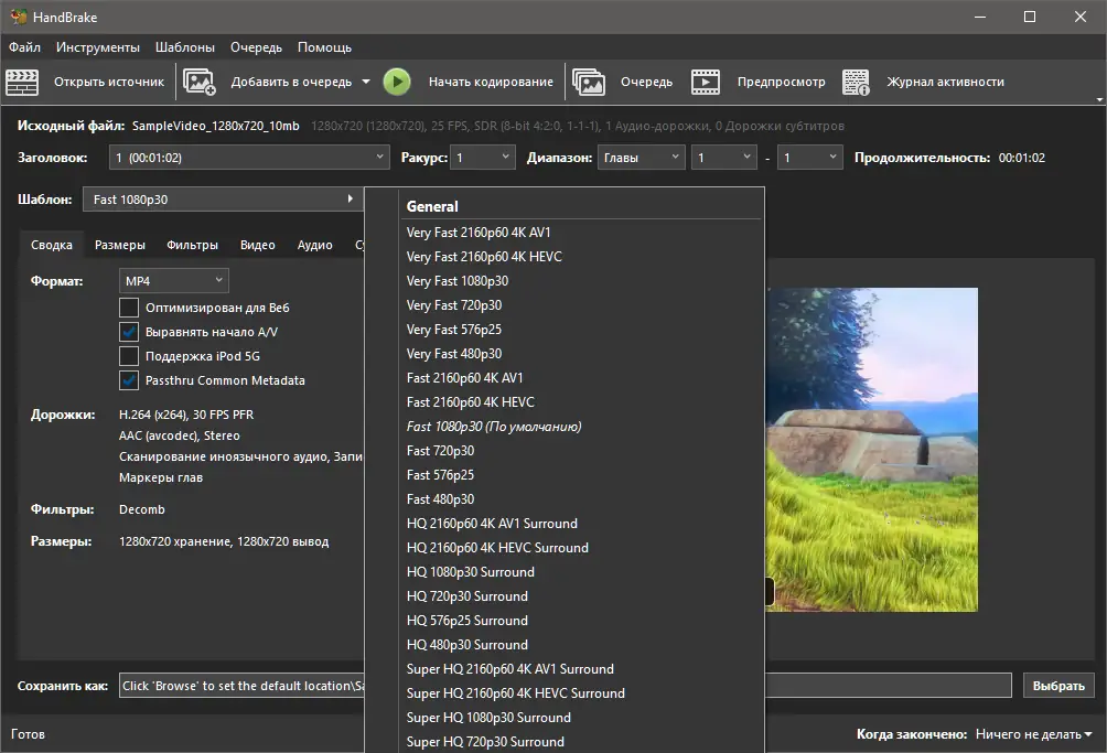 - Использование различных фильтров: Deinterlace, Decomb, Deblock, Detelecine, Grayscale, Cropping, Scaling