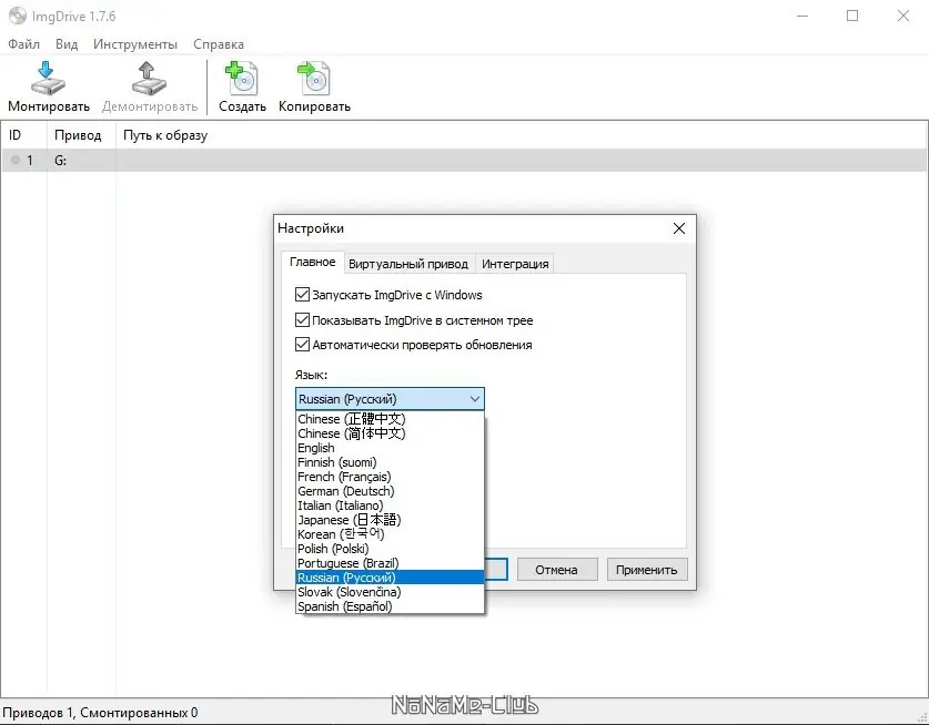 - При необходимости произвести настройку языка или количества виртуальных приводов через соответствующие меню.
